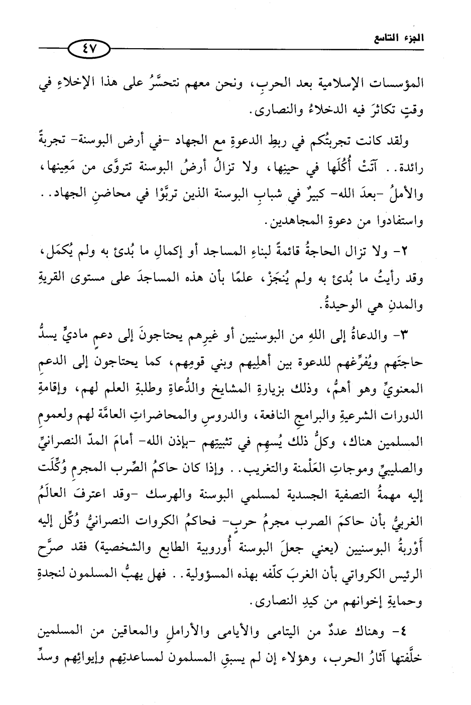 ولقد كانت تجربتُكم في ربطِ الدعوةِ مع الجهاد -في أرض البوسنة- تجربةً رائدة .. آتَتْ أُكُلَها في حينِها، ولا تزالُ أرضُ البوسنة تتروَّى من مَعِينها، والأملُ -بعدَ الله- كبيرٌ في شبابِ البوسنة الذين تربَّوْا في محاضنِ الجهاد .. واستفادوا من دعوةِ المجاهدين.
