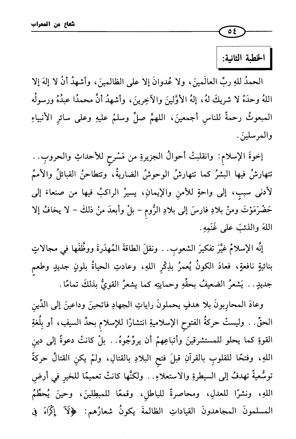 وعادَ المحارِبونَ بلا هدفٍ يحملونَ راياتِ الجهادِ فاتحينَ وداعينَ إلى الدِّينِ الحقِّ .. وليستْ حركةُ الفتوحِ الإسلاميةِ انتشارًا للإسلامِ بحدِّ السيفِ، أو بِلُغةِ القوةِ كما يحلو للمستشرقينَ وأتباعِهمْ أن يروِّجُوهُ .. بلْ كانتْ دعوةً إلى دينِ اللهِ، وفتحًا للقلوبِ بالقرآنِ قبلَ فتحِ البلادِ بالقتالِ، ولمْ يكنِ القتالُ حركةً توسُّعيةً تهدفُ إلى السيطرةِ والاستعلاءِ .. ولكنَّها كانتْ تعميمًا للخيرِ في أرضِ اللهِ، ونشرًا للعدلِ، ومحاصرةً للباطلِ، وقمعًا للمبطِلينَ، وحينَ يُحطِّمُ المسلمونَ المجاهدونَ القياداتِ الظالمةَ يكونُ شعارُهم: {لَا إِكْرَاهَ فِي