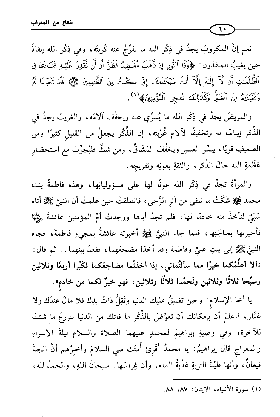 يا أخا الإسلامِ: وحين تضيقُ عليك الدنيا وتَقِلُّ ذاتُ يدِك فلا مالَ عندَك ولا عَقَار، فاعلمْ أن بإمكانك أن تعوِّضَ بالذِّكْر ما فاتك من الدنيا لتزرعَ ما شئتَ للآخرة، وفي وصيةِ إبراهيمَ لمحمدٍ عليهما الصلاة والسلام ليلةَ الإسراءِ والمعراجِ قال إبراهيمُ: يا محمدُ أَقْرِئ أُمتَك مني السلامَ وأخبِرْهم أنَّ الجنةَ قيعانٌ، وأنها طيِّبةُ التربةِ عَذْبةُ الماء، وأن غِراسَها: سبحانَ اللهِ، والحمدُ لله،