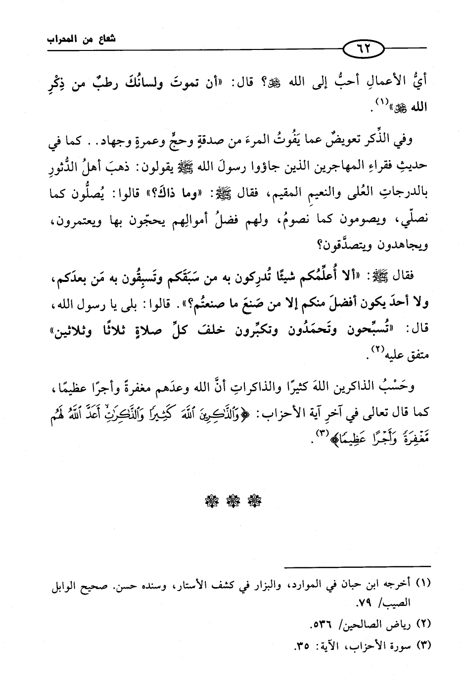 وحَسْبُ الذاكرين اللهَ كثيرًا والذاكراتِ أنَّ الله وعدَهم مغفرةً وأجرًا عظيمًا، كما قال تعالى في آخرِ آية الأحزاب: {وَالذَّاكِرِينَ اللَّهَ كَثِيرًا وَالذَّاكِرَاتِ أَعَدَّ اللَّهُ لَهُمْ مَغْفِرَةً وَأَجْرًا عَظِيمًا} (¬3).