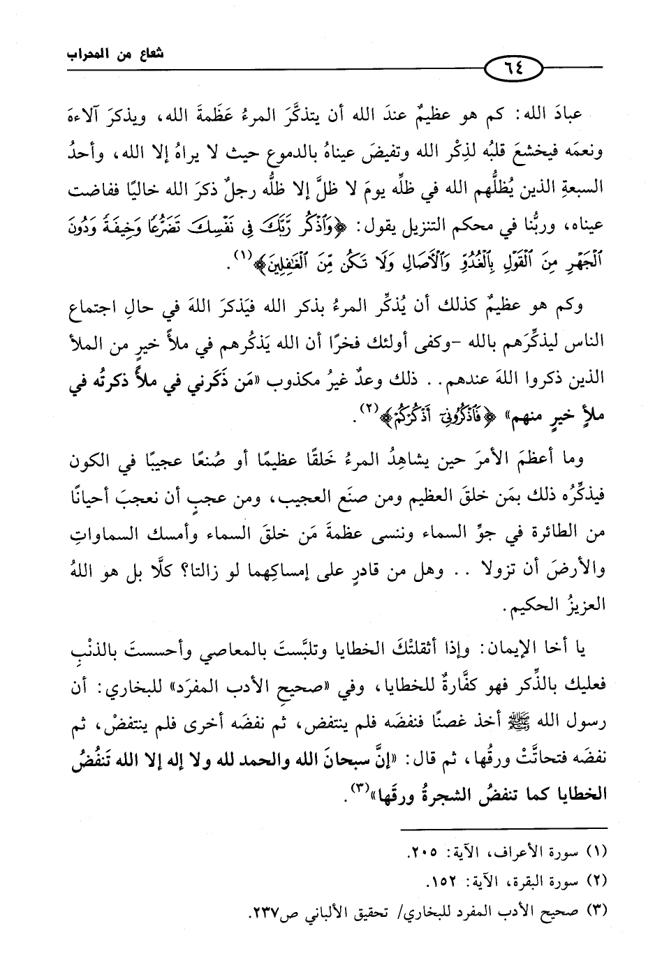 يا أخا الإيمان: وإذا أثقلتْكَ الخطايا وتلبَّستَ بالمعاصي وأحسستَ بالذنْبِ فعليك بالذِّكر فهو كفَّارةٌ للخطايا، وفي صحيحِ الأدب المفرَد للبخاري: أن رسول الله صلى الله عليه وسلم أخذ غصنًا فنفضَه فلم ينتفض، ثم نفضَه أخرى فلم ينتفضْ، ثم نفضَه فتحاتَّتْ ورقُها، ثم قال: «إنَّ سبحانَ الله والحمد لله ولا إله إلا الله تَنفُضُ الخطايا كما تنفضُ الشجرةُ ورقَها» (¬3).