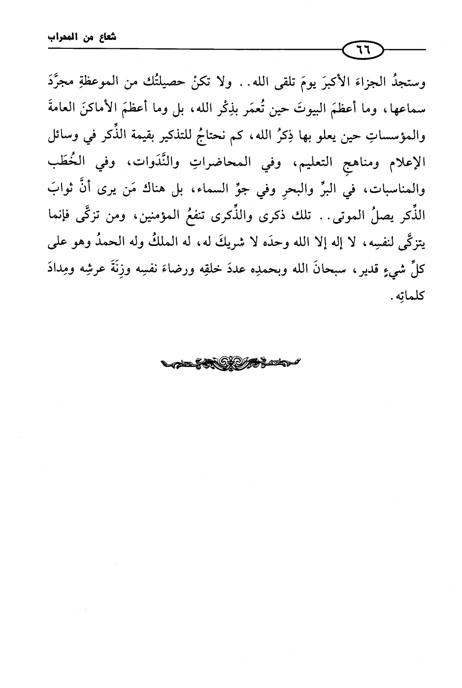 وستجدُ الجزاءَ الأكبرَ يومَ تلقى الله .. ولا تكنْ حصيلتُك من الموعظةِ مجرَّدَ سماعها، وما أعظمَ البيوتَ حين تُعمَر بذِكْر الله، بل وما أعظمَ الأماكنَ العامةَ والمؤسساتِ حين يعلو بها ذِكرُ الله، كم نحتاجُ للتذكير بقيمة الذِّكر في وسائل الإعلام ومناهجِ التعليم، وفي المحاضراتِ والنَّدَوات، وفي الخُطَب والمناسبات، في البرِّ والبحرِ وفي جوِّ السماء، بل هناك مَن يرى أنَّ ثوابَ الذِّكر يصلُ الموتى .. تلك ذكرى والذِّكرى تنفعُ المؤمنين، ومن تزكَّى فإنما يتزكَّى لنفسِه، لا إله إلا الله وحدَه لا شريكَ له، له الملكُ وله الحمدُ وهو على كلِّ شيءٍ قدير، سبحانَ الله وبحمدِه عددَ خلقِه ورضاءَ نفسِه وزِنَةَ عرشِه ومِدادَ كلماتِه.