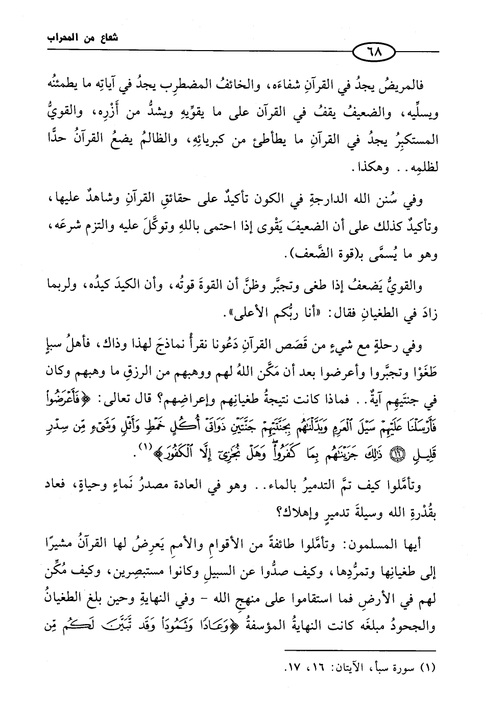 فالمريضُ يجدُ في القرآنِ شفاءَه، والخائفُ المضطرِب يجدُ في آياتِه ما يطمئنُه ويسلِّيه، والضعيفُ يقفُ في القرآن على ما يقوِّيهِ ويشدُّ من أَزْرِه، والقويُّ المستكبِرُ يجدُ في القرآنِ ما يطأطئ من كبريائِهِ، والظالمُ يضعُ القرآنُ حدًّا لظلمِه .. وهكذا.