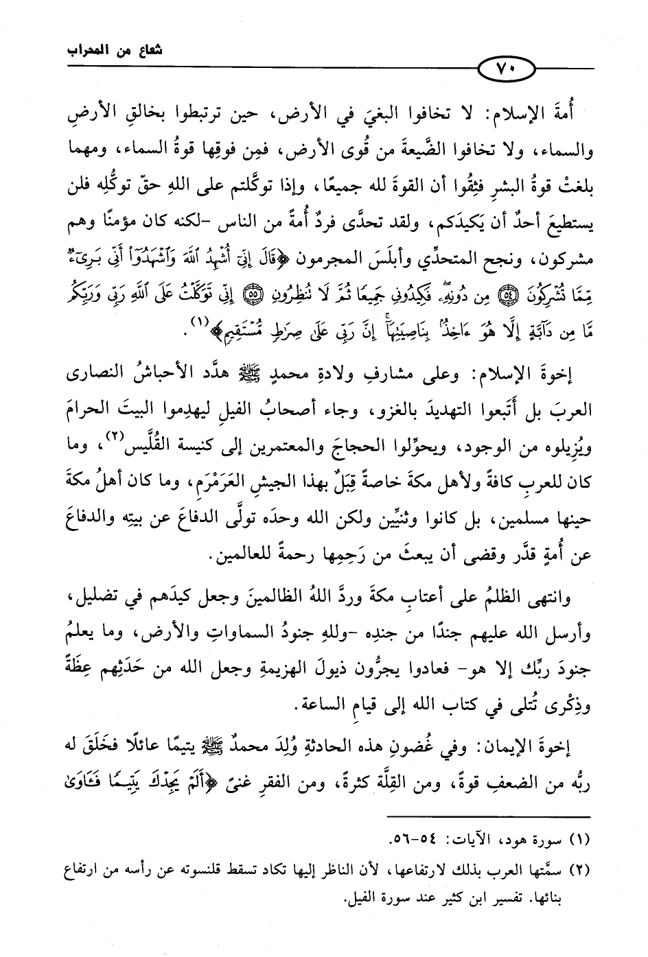 إخوةَ الإسلام: وعلى مشارفِ ولادةِ محمدٍ صلى الله عليه وسلم هدَّد الأحباشُ النصارى العربَ بل أَتَبعوا التهديدَ بالغزو، وجاء أصحابُ الفيلِ ليهدِموا البيتَ الحرامَ ويُزِيلوه من الوجود، ويحوِّلوا الحجاجَ والمعتمرين إلى كنيسة القُلَّيس (¬2)، وما كان للعربِ كافةً ولأهل مكةَ خاصةً قِبَلٌ بهذا الجيشِ العَرَمْرَمِ، وما كان أهلُ مكةَ حينها مسلمين، بل كانوا وثنيِّين ولكن الله وحدَه تولَّى الدفاعَ عن بيتِه والدفاعَ عن أُمةٍ قدَّر وقضى أن يبعثَ من رَحِمِها رحمةً للعالمين.