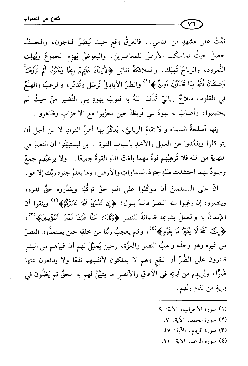 إنّ على المسلمينَ أن يتوكَّلوا على اللهِ حقَّ توكُّلِه ويقدِّروه حقَّ قدرِه، وينصروه إن رغِبوا منه النصرَ فاللهُ يقول: {إِنْ تَنْصُرُوا اللَّهَ يَنْصُرْكُمْ} (¬2) ويثقوا أن الإيمانَ به والعملَ بشرعِه ضمانةٌ للنصر {وَكَانَ حَقًّا عَلَيْنَا نَصْرُ الْمُؤْمِنِينَ} (¬3)، {إِنَّ اللَّهَ لَا يُغَيِّرُ مَا بِقَوْمٍ} (¬4)، وكم يعجبُ ربُّنا من خلقِه حين يستمدُّون النصرَ من غيرِه وهو وحدَه واهبُ النصرِ والعزَّة، وحين يُخيَّلُ لهم أن غيرَهم من البشرِ قادرون على الضُّرِّ أو النفعِ وهم لا يملكون لأنفسِهم نفعًا ولا يدفعون عنها ضُرًّا، ويُريهِم من آياتِه في الآفاقِ والأنفسِ ما يتبيَّنُ لهم به الحقُّ ثم يَظلُّون في مِريةٍ من لقاءِ ربِّهم.