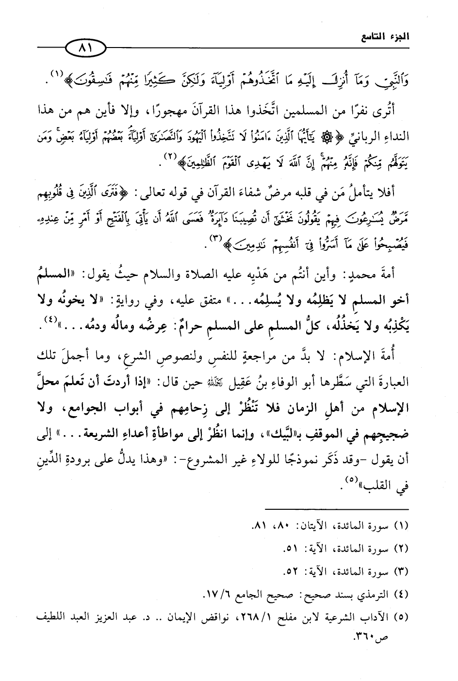 أتُرى نفرًا من المسلمين اتَّخَذوا هذا القرآنَ مهجورًا، وإلا فأين هم من هذا النداءِ الربانيِّ {يَا أَيُّهَا الَّذِينَ آمَنُوا لَا تَتَّخِذُوا الْيَهُودَ وَالنَّصَارَى أَوْلِيَاءَ بَعْضُهُمْ أَوْلِيَاءُ بَعْضٍ وَمَنْ يَتَوَلَّهُمْ مِنْكُمْ فَإِنَّهُ مِنْهُمْ إِنَّ اللَّهَ لَا يَهْدِي الْقَوْمَ الظَّالِمِينَ} (¬2).