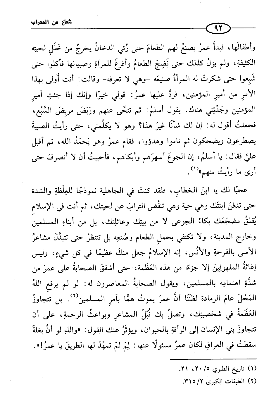 عجبًا لك يا ابنَ الخطابِ، فلقد كنتَ في الجاهلية نموذجًا للغِلْظةِ والشدة حتى تدفنَ ابنتَك وهي حية وهي تنفُض الترابَ عن لحيتك، ثم أنت في الإسلامِ يُقلقُ مضجَعَك بكاءُ الجوعى لا من بيتِك وعائلِتك، بل من أبناءِ المسلمين وخارج المدينة، ولا تكتفي بحملِ الطعام وصُنعِه بل تنتظرُ حتى تتبدَّلَ مشاعرُ الأسى بالفرحةِ والأنُس، إنه الإسلامُ جعل منكَ عظيمًا في كل شيءٍ، وليس إغاثةُ الملهوفِينَ إلا جزءًا من هذه العَظَمة، حتى أشفقَ الصحابةُ على عمرَ من شدَّةِ اهتمامِه بالمسلمين، ويقول الصحابةُ المعاصرون له: لو لم يرفعِ اللهُ المَحْلَ عامَ الرمادة لظنَنّا أنَّ عمرَ يموتُ همًّا بأمرِ المسلمين (¬2). بل تتجاوزُ العَظَمةُ في شخصيتِك، وتصلُ بك نُبْلُ المشاعرِ وبواعثُ الرحمةِ، على أن تتجاوزَ بني الإنسان إلى الرأفةِ بالحيوان، ويؤثَرُ عنك القول: «واللهِ لو أنَّ بغلةً سقطتْ في العراقِ لكان عمرُ مسئولًا عنها: لِمَ لمْ تمهِّدْ لها الطريقَ يا عمرُ! ».