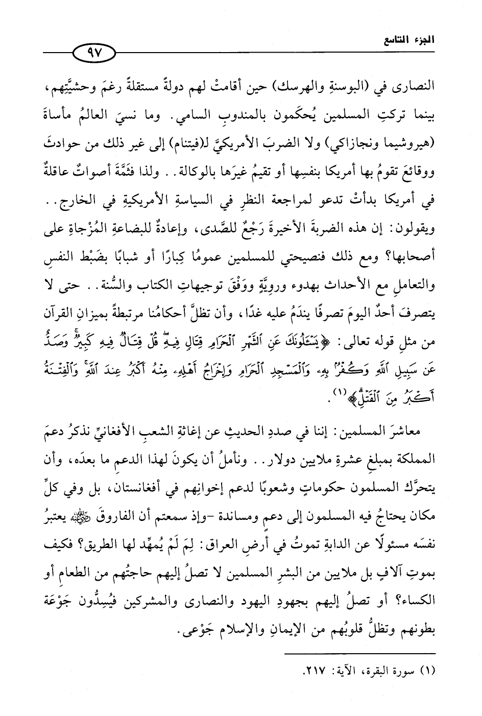 النصارى في (البوسنةِ والهرسك) حين أقامتْ لهم دولةً مستقلةً رغمَ وحشيَّتِهم، بينما تركتِ المسلمين يُحكَمون بالمندوبِ السامي. وما نسيَ العالمُ مأساةَ (هيروشيما ونجازاكي) ولا الضربَ الأمريكيَّ لـ (فيتنام) إلى غير ذلك من حوادثَ ووقائعَ تقومُ بها أمريكا بنفسِها أو تقيمُ غيرَها بالوكالة .. ولذا فثَمَّةَ أصواتٌ عاقلةٌ في أمريكا بدأتْ تدعو لمراجعة النظرِ في السياسةِ الأمريكيةِ في الخارج .. ويقولون: إن هذه الضربةَ الأخيرةَ رَجْعٌ للصَّدى، وإعادةٌ للبضاعةِ المُزْجاةِ على أصحابها؟ ومع ذلك فنصيحتي للمسلمين عمومًا كِبارًا أو شبابًا بضَبْط النفسِ والتعاملِ مع الأحداث بهدوء وروِيَّةٍ ووَفْقَ توجيهاتِ الكتاب والسُّنة .. حتى لا يتصرفَ أحدٌ اليومَ تصرفًا يندَمُ عليه غدًا، وأن تظلَّ أحكامُنا مرتبطةً بميزانِ القرآن من مثلِ قوله تعالى: {يَسْأَلُونَكَ عَنِ الشَّهْرِ الْحَرَامِ قِتَالٍ فِيهِ قُلْ قِتَالٌ فِيهِ كَبِيرٌ وَصَدٌّ عَنْ سَبِيلِ اللَّهِ وَكُفْرٌ بِهِ وَالْمَسْجِدِ الْحَرَامِ وَإِخْرَاجُ أَهْلِهِ مِنْهُ أَكْبَرُ عِنْدَ اللَّهِ وَالْفِتْنَةُ أَكْبَرُ مِنَ الْقَتْلِ} (¬1).