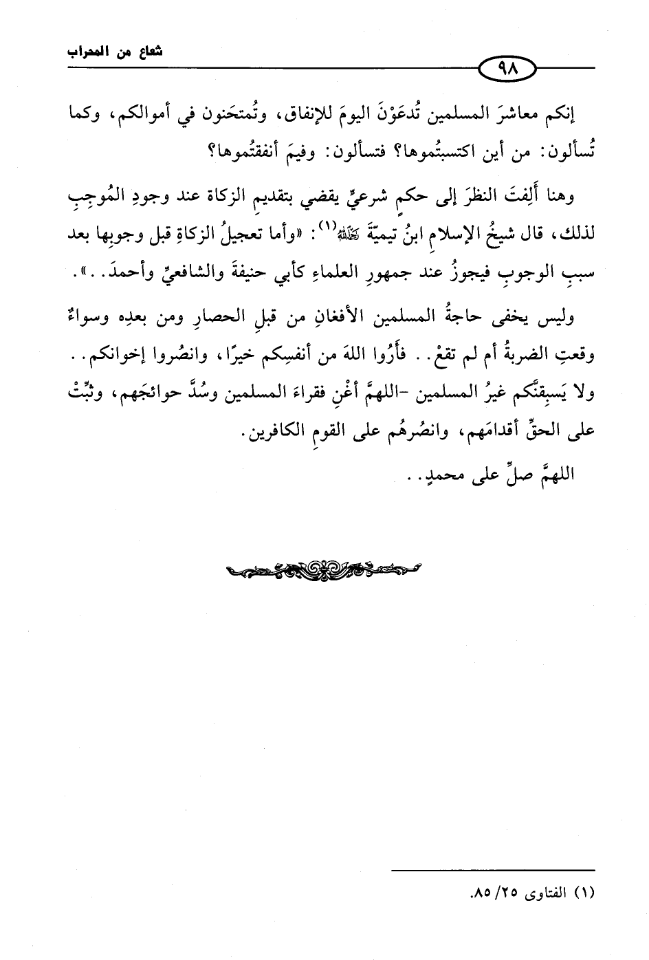 وليس يخفى حاجةُ المسلمين الأفغانِ من قبلِ الحصارِ ومن بعدِه وسواءٌ وقعتِ الضربةُ أم لم تقعْ .. فأَرُوا اللهَ من أنفسِكم خيرًا، وانصُروا إخوانكم .. ولا يَسبِقنَّكم غيرُ المسلمين -اللهمَّ أغْنِ فقراءَ المسلمين وسُدَّ حوائجَهم، وثبِّتْ على الحقِّ أقدامَهم، وانصُرهُم على القومِ الكافرين.