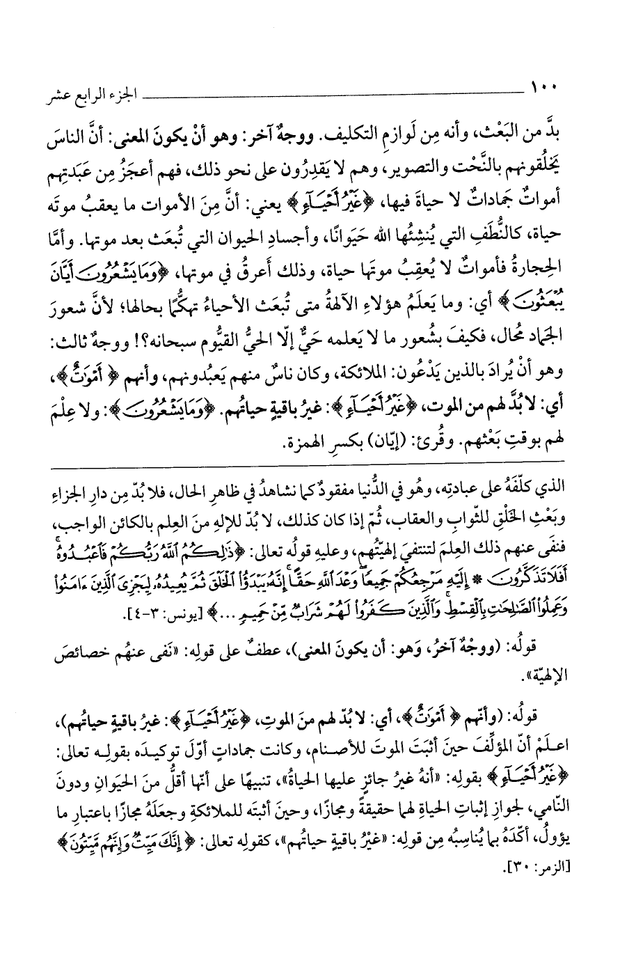 قوله: (وأنهم (أَمْوَاتٌ)، أي: لابد لهم من الموت، (غَيْرُ أَحْيَاءٍ): غير باقية حياتهم)، اعلم أن المؤلف حين أثبت الموت للأصنام، وكانت جمادات أول توكيده بقوله تعالى: (غَيْرُ أَحْيَاءٍ) بقوله: "أنه غير جائز عليها الحياة"، تنبيهاً على أنها أقل من الحيوان ودون النامي، لجواز إثبات الحياة لهما حقيقة ومجازاً، وحين أثبته للملائكة وجعله مجازاً باعتبار ما يؤول، أكده بما يناسبه من قوله: "غير باقية حياتهم"، كقوله تعالى: (إِنَّكَ مَيِّتٌ وَإِنَّهُمْ مَيِّتُونَ) [الزمر: 30].