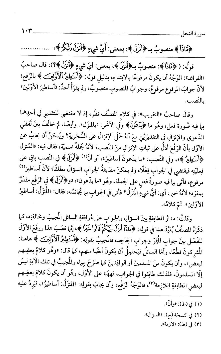 وقال صاحب "التقريب": في كلام المصنف نظر، إذ لا مقتضى للتقدير في أحدهما بما فيه صورة فعل، وهو ما (يَدْعُونَ) وفي الآخر: "بالمنزل". وأيضاً، لم خالف بين لفظي الدعوى والإنزال في التقديرين مع انه حمل الإنزال على السخرية؟ ويُمكن أن يجاب عن الأول بأن الرفع أدل على ثبات الإنزال من النصب؛ لأنه جملة اسمية، فقال فيه: "المُنزل (أَسَاطِيرُ) "، وفي النصب: "ما يدعون أساطير"، أو أن (أَنزَلَ) في النصب باقٍ على فعليته فيقتضي في الجواب فعلاً، ولم يمكن مطابقة الجواب السؤال مطلقاً؛ لأن أساطير مرفوع، فأتى بما فيه صورة فعل على الجملة، وهو "ما يدعون"، "و (أَنزَلَ) في الرفع مقدرٌ بمفرد؛ لأنه خبر، أي: أي شيء المنزل؟ فأتى في الجواب بما يُجانسه، فقال: "المنزلُ: أساطير الأولين". تم كلامه.