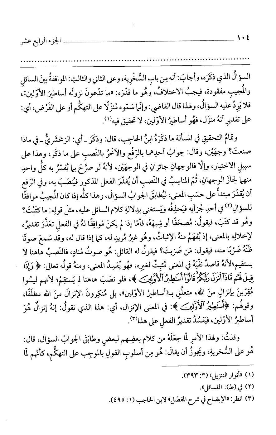 السؤال الذي ذكره، وأجاب: أنه من باب السخرية، وعلى الثاني والثالث: الموافقة بين السائل والمجيب مفقودة، فيجب الاختلاف، وهو ما قدره: "ما تدعون نزوله أساطير الأولين"، فلا يردُ عليه السؤال، ولهذا قال القاضي: وإنما سموه منزلاً على التهكم أو على الفرض، أي: على تقدير أنه منزل، فهو أساطير الأولين، لا تحقيق فيه.