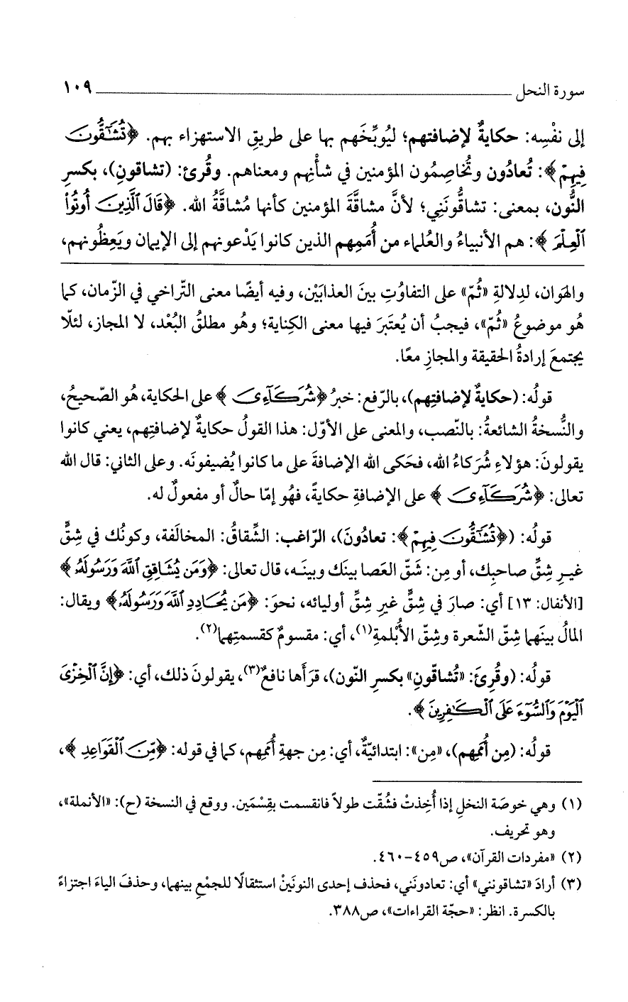 قوله: (حكاية لإضافتهم)، بالرفع: خبر (شُرَكَائِي) على الحكاية، هو الصحيح، والنسخة الشائعة: بالنصب، والمعنى على الأول: هذا القول حكاية لإضافتهم، يعني كانوا يقولون: هؤلاء شركاء الله، فحكى الله الإضافة على ما كانوا يضيفونه. وعلى الثاني: قال الله تعالى: (شُرَكَائِي) على الإضافة حكاية، فهو إما حال أو مفعول له.