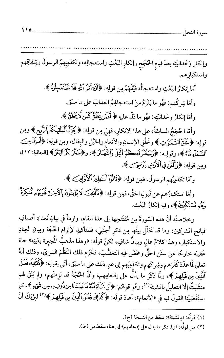 وخلاصته أن هذه السورة من مفتتحها إلى هذا المقام، واردة في بيان تعداد أصناف قبائح المشركين، ما قد تخلل بينها من ذكر أجنبي، فللتأكيد لإلزام الحجة وبيان العناد والإستكبار، وهذا كلام عالٍ وبيان شاف، لكن قوله: "وهذا مذهب المجبرة بعينه" جاء عقيبه خارجاً عن سنن الحق ومحض فيه التعصب، فخرم ذلك النظم السري، وذلك أنه تعالى لما عدد كُفرهم وشركهم وتكذيبهم إلى غير ذلك على ما سبق، أتى بقوله: (كَذَلِكَ فَعَلَ الَّذِينَ مِنْ قَبْلِهِمْ)، ولما ذكر ما يدل على إفحامهم، وأن الحجة قد لزمتهم، ولم يبق لهم متشبث إلا التعليل بالمشيئة، وهو قولهم: (لَوْ شَاءَ اللَّهُ مَا عَبَدْنَا مِنْ دُونِهِ مِنْ شَيْءٍ)، كما استقصينا القول فيه في "الأنعام"، أعاد قوله: (كَذَلِكَ فَعَلَ الَّذِينَ مِنْ قَبْلِهِمْ) ليريك أن