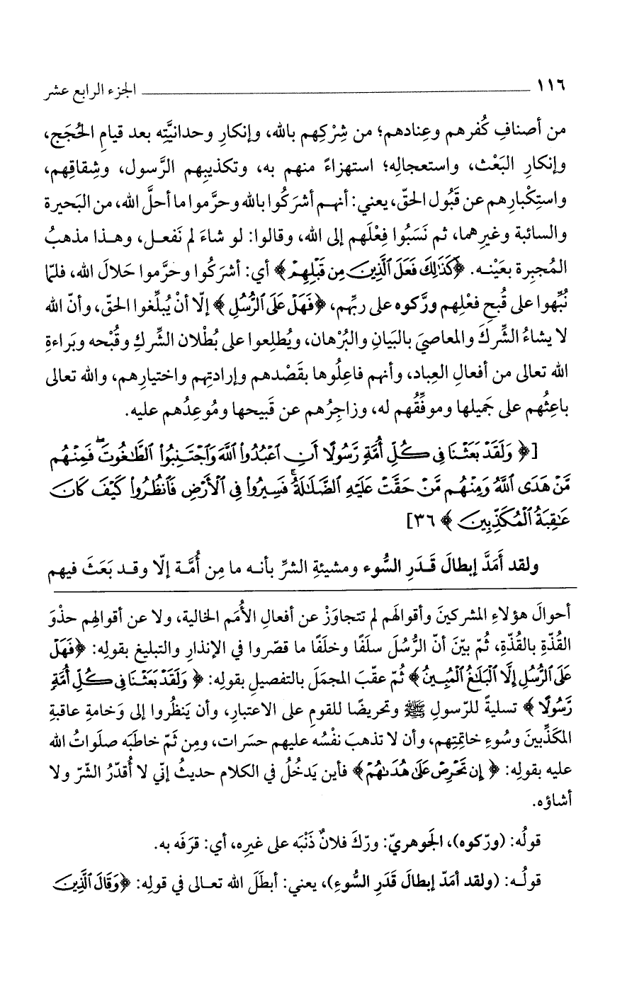 [(وَلَقَدْ بَعَثْنا فِي كُلِّ أُمَّةٍ رَسُولاً أَنِ اعْبُدُوا اللَّهَ وَاجْتَنِبُوا الطَّاغُوتَ فَمِنْهُمْ مَنْ هَدَى اللَّهُ وَمِنْهُمْ مَنْ حَقَّتْ عَلَيْهِ الضَّلالَةُ فَسِيرُوا فِي الْأَرْضِ فَانْظُرُوا كَيْفَ كانَ عاقِبَةُ الْمُكَذِّبِينَ)].