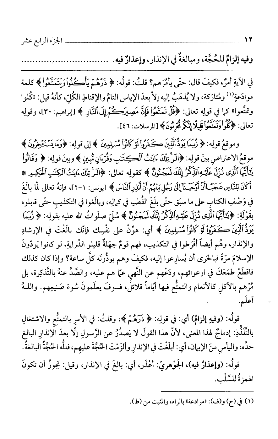 قوله: (وفيه إلزام) أي: في قوله: (ذَرْهُمْ)، وقلت: في الأمر بالتمتع والاشتغال بالتلذذ: إدماج لهذا المعنى، لأن هذا القول لا يصدر عن الرسول إلا بعد الإنذار البالغ حده، واليأس من الإيمان، أي: أبلغت في الإنذار وألزمت الحجة عليهم، فلله الحجة البالغة.