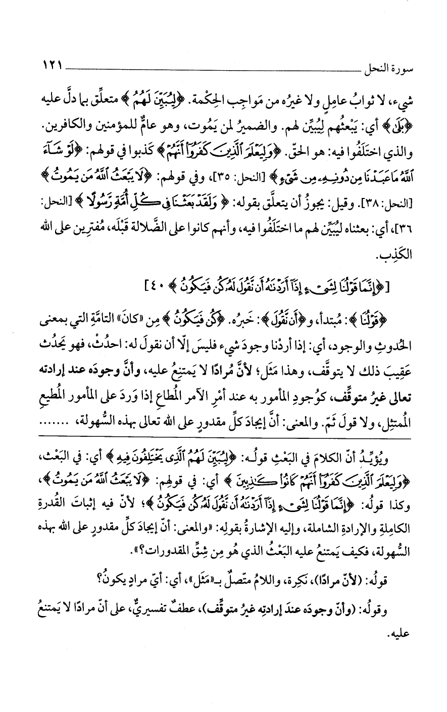 ويؤيد أن الكلام في البعث قوله: (لِيُبَيِّنَ لَهُمْ الَّذِي يَخْتَلِفُونَ فِيهِ) أي: في البعث، (وَلِيَعْلَمَ الَّذِينَ كَفَرُوا أَنَّهُمْ كَانُوا كَاذِبِينَ) أي: في قولهم: (لا يَبْعَثُ اللَّهُ مَنْ يَمُوتُ)، وكذا قوله: (إِنَّمَا قَوْلُنَا لِشَيْءٍ إِذَا أَرَدْنَاهُ أَنْ نَقُولَ لَهُ كُنْ فَيَكُونُ)؛ لأن فيه إثبات القدرة الكاملة والإرادة الشاملة، وإليه الإشارة بقوله: "والمعنى: أن إيجاد كل مقدور على الله بهذه السهولة، فكيف يمتنع عليه البعث الذي هو من شق المقدورات؟ ".