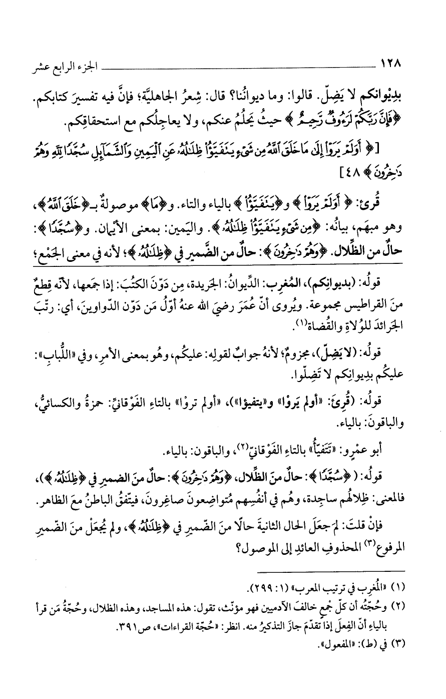 قرئ: (أولم يروا) و (يتفيؤا)، بالياء والتاء. و (ما) موصولة بـ (خلق الله)، وهو مبهم بيانه: (مِنْ شَيْءٍ يَتَفَيَّؤُا ظِلالُهُ). واليمين: بمعنى الأيمان. (وسُجَّداً) حال من الظلال. وَهُمْ داخِرُونَ حال من الضمير في (ظلاله)، لأنه في معنى الجمع؛