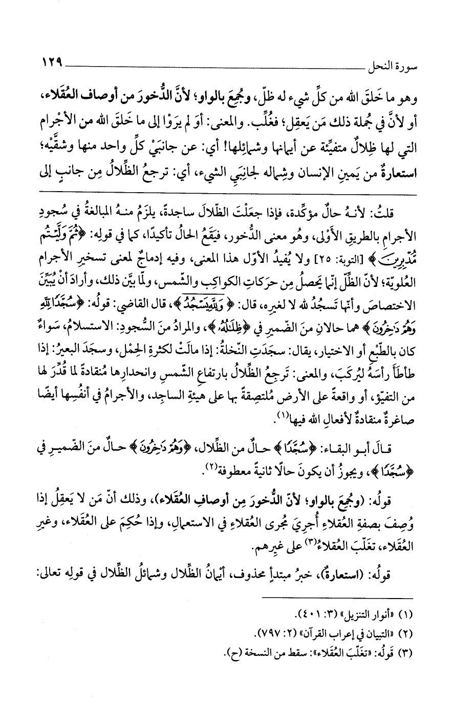 قلت: لأنه حال مؤكدة، فإذا جعلت الظلال ساجدة، يلزم منه المبالغة في سجود الأجرام بالطريق الأولى، وهو معنى الدخور، فيقع الحال تأكيداً، كما في قوله: (ثُمَّ وَلَّيْتُمْ مُدْبِرِينَ) [التوبة: 25] ولايفيد الأول هذا المعنى، وفيه إدماج لمعنى تسخير الأجرام العلوية، لأن الظل إنما يحصل من حركات الكواكب والشمس، ولما بين ذلك، وأراد أن يُبين الاختصاص وأنها تسجد لله لا لغيره، قال: (وَلِلَّهِ يَسْجُدُ)، قال القاضي: قوله: (سُجَّداً لِلَّهِ وَهُمْ دَاخِرُونَ) هما حالان من الضمير في (ظِلالهُ)، والمراد من السجود الاستسلام، سواء كان بالطبع أو الاختيار، يقال: سجدت النخلة: إذا مالت لكثرة الحمل، وسجد البعير إذا طأطأ رأسه ليُركب، والمعنى: ترجعُ الظلالُ بارتفاع الشمس وانحدارها منقادة لما قُدر لها من التفيؤ، أو واقعة على الأرض ملتصقة بها على هيئة الساجد، والأجرام في أنفسها أيضاً صاغرة منقادة لأفعال الله فيها.