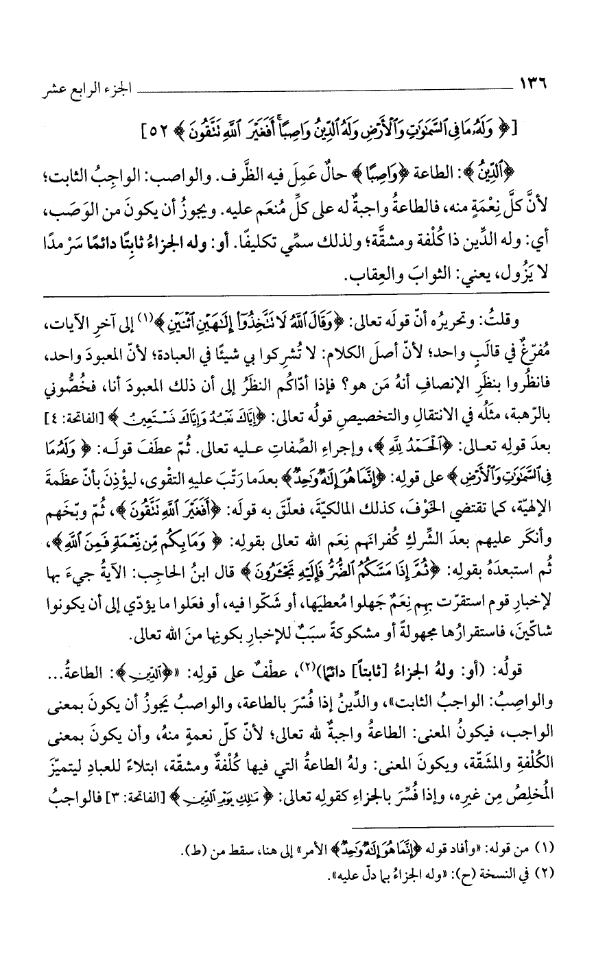 قوله: (أو: ولهُ الجزاء [ثابتاً] دائماً) ن عطفٌ على قوله: " (الِدَيْنِ): الطاعةُ ... والواصب: الواجب الثابت"، والدين إذا فُسر بالطاعة، والواصب يجوز أن يكون بمعنى الواجب، فيكون المعنى: الطاعة واجبة لله تعالى؛ لأن كل نعمة منهُ، وأن يكون بمعنى الكلفة والمشقة، ويكون المعنى: وله الطاعة التي فيها كلفة ومشقة، ابتلاء للعباد ليتميز المخلص من غيره، وإذا فُسر بالجزاء كقوله تعالى (مَالِكِ يَوْمِ الدِّينِ) [الفاتحة: 3] فالواجب