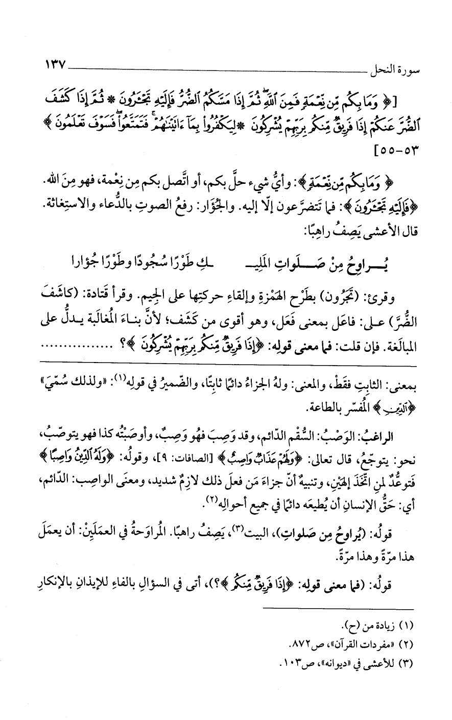 (ما بِكُمْ مِنْ نِعْمَة) وأي شيء حل بكم، أو اتصل بكم من نعمة، فهو من الله (فَإِلَيْهِ تَجْئَرُونَ) فما تتضرعون إلا إليه، والجؤار: رفع الصوت بالدعاء والاستغاثة. قال الأعشى يصف راهبا: