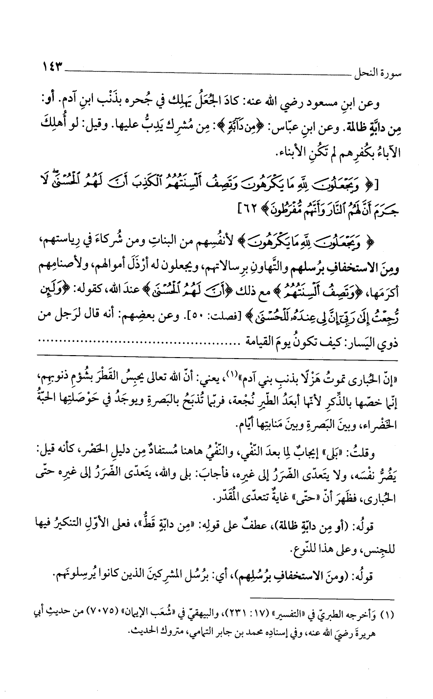 وقلت: "بلى" إيجابٌ لما بعد النفي، والنفي هاهنا مستفاد من دليل الحصر، كأنه قيل: يضُر نفسه، ولا يتعدى الضرر إلى غيره، فأجاب: بلى والله، يتعدى الضرر إلى غيره حتى الحبارى، فظهر أن "حتى" غاية تتعدى المقدر.