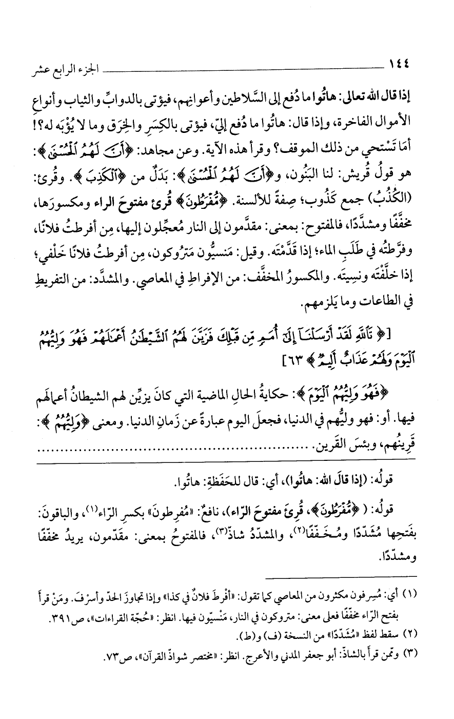 قوله: ((مُفْرَطُونَ)، قرئ مفتوح الراء)، نافع: "مفرطون" بكسر الراء، والباقون: بفتحها مُشدداً ومخففاً، والمشدد شاذ، فالمفتوح بمعنى: مقدمون، يريد مخففاً ومشدداً.