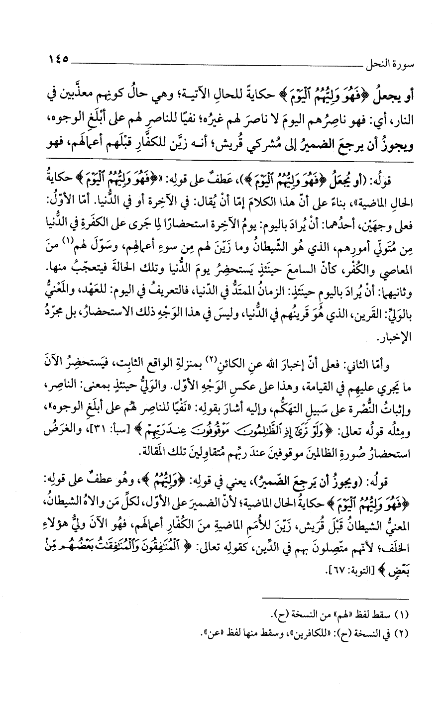 قوله: (أو يُجعل (فَهُوَ وَلِيُّهُمْ الْيَوْمَ)، عطف على قوله: " (فَهُوَ وَلِيُّهُمْ الْيَوْمَ) حكاية الحال الماضية"، بناء على أن هذا الكلام إما أن يُقال: في الآخرة أو في الدنيا. أما الأول: فعلى وجهين، أحدهما: أن يُراد باليوم: يوم الآخرة استحضاراً لما جرى على الكفرة في الدنيا من متولي أمورهم، الذي هو الشيطان وما زين لهم من سوء أعمالهم، وسول لهم من المعاصي والكفر، كأن السامع حينئذ يستحضر يوم الدنيا وتلك الحالة فيتعجب منها. وثانيهما: أن يُراد باليوم حينئذ: الزمان الممتد في الدنيا، فالتعريف في اليوم: للعهد، والمعنى بالولي: القرين، الذي هو قرينهم في الدنيا، وليس في هذا الوجه ذلك الاستحضار، بل مجرد الإخبار.