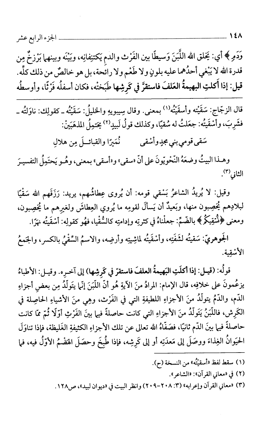 قوله: (قيل: إذا أكلت البهيمة العلف فاستقر في كرشها) إلى آخره. وقيل: الأطباء يزعمون على خلافه، قال الإمام: المراد من الآية هو أن اللبن إنما يتولد من بعض أجزاء الدم، والدم يتولد من الأجزاء اللطيفة التي في الفرث، وهي من الأشياء الحاصلة في الكرش، فاللبن يتولد من الأجزاء التي كانت حاصلة فيما بين الفرث أولاً ثم مما كانت حاصلة فيما بين الدم ثانياً، فصفاه الله تعالى عن تلك الجزاء الكثيفة الغليظة، فإذا تناول الحيوان الغذاء ووصل إلى معدته أو إلى كرشه، فإذا طُبخ وحصل الهضم الأول فيه، فما