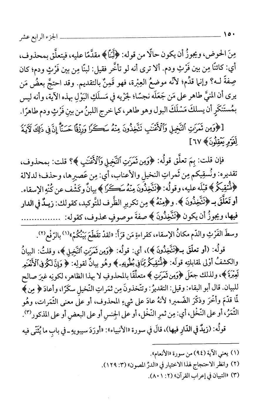 فإن قلت: بم تعلق قوله: (وَمِنْ ثَمَراتِ النَّخِيلِ وَالْأَعْنابِ)؟ قلت: بمحذوف تقديره: ونسقيكم من ثمرات النخيل والأعناب، أي: من عصيرها، وحذف لدلالة (نسقيكم) قبله عليه، وقوله (تَتَّخِذُونَ مِنْهُ سَكَراً) بيان وكشف عن كنه الإسقاء. أو تعلق بـ (تتخذون). و (منه) من تكرير الظرف للتوكيد، كقولك: زيد في الدار فيها. ويجوز أن يكون (تَتَّخِذُونَ) صفة موصوف محذوف، كقوله:
