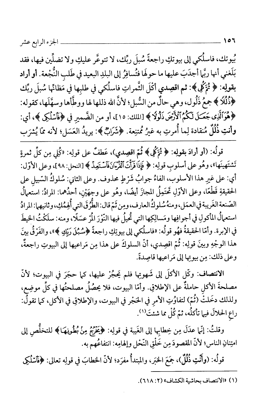 قوله: (أو أراد بقوله: (ثُمَّ كُلِي) ثم اقصدي)، عطفٌ على قوله: "كلي من كل ثمرة تشتهينها"، وهو على أسلوب قوله: (فَإِذَا قَرَاتَ الْقُرْآنَ فَاسْتَعِذْ) [النحل: 98]، وعلى الأول: أي: على غير هذا الأسلوب، الفاء جواب شرط محذوف. وعلى الثاني: سلوك السبيل على الحقيقة قطعاً، وعلى الأول تحتمل المجاز أيضاً، وهو على وجهين، أحدهما: المرادُ: استعمال الصنعة الغريبة في العمل، ومنه سلوك العارف، ومن ثم قال: الطرق التي ألهمك، وثانيهما: المراد استعمال المأكول في أجوافها ومسالكها التي تُحيل فيها النور المر عسلاً، ومنه: سلكت الخيط في الإبرة. وأما الحقيقة فهو قوله: "فاسلكي إلى بيوتك راجعة (سُبُلَ رَبِّكِ) "، والفرق بين هذا الوجه وبين قوله: ثم اقصدي، أن السلوك على هذا من مراعيها إلى البيوت راجعة، وعلى ذلك: من بيوتها إلى مراعيها قاصدة.