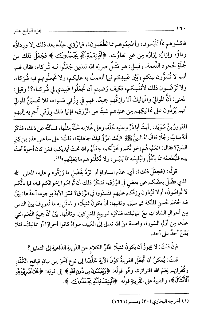 فاكسوهم مما تلبسون، وأطعموهم مما تطعمون)، فما رؤي عبده بعد ذلك إلا ورداؤه رداؤه وإزاره إزاره من غير تفاوت. (أَفَبِنِعْمَةِ اللَّهِ يَجْحَدُونَ) فجعل ذلك من جملة جحود النعمة. وقيل: هو مثل ضربه الله للذين جعلوا له شركاء، فقال لهم: أنتم لا تسوّون بينكم وبين عبيدكم فيما أنعمت به عليكم، ولا تجعلونهم فيه شركاء، ولا ترضون ذلك لأنفسكم، فكيف رضيتم أن تجعلوا عبيدي لي شركاء؟ ! وقيل: المعنى: أنّ الموالي والمماليك أنا رازقهم جميعاً، فهم في رزقي سواء، فلا تحسبن الموالي أنهم يردون على مماليكهم من عندهم شيئاً من الرزق، فإنما ذلك رزقي أجريه إليهم