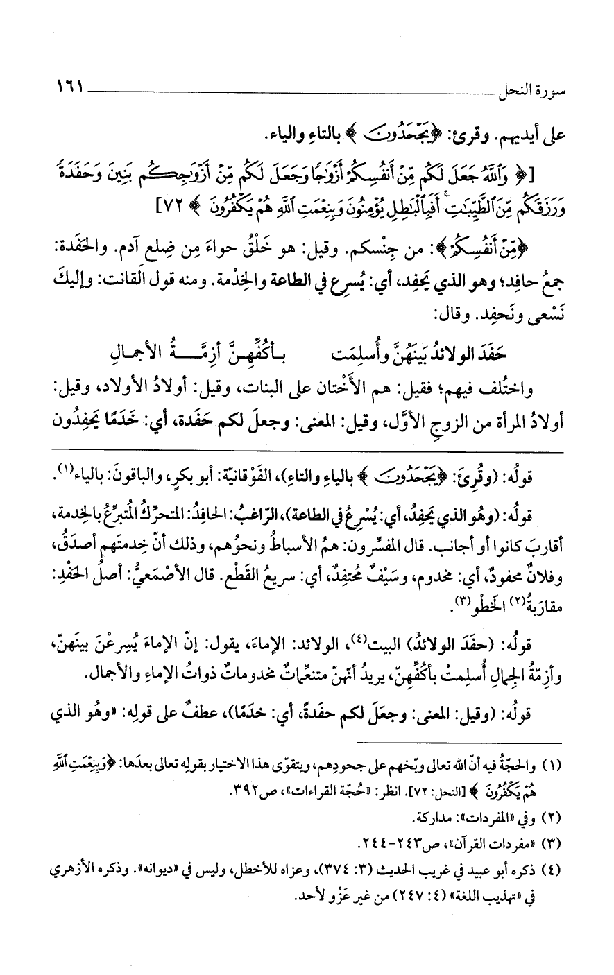(مِنْ أَنْفُسِكُمْ): من جنسكم. وقيل: هو خلق حواء من ضلع آدم. والحفدة: جمع حافد؛ وهو الذي يحفد، أي: يسرع في الطاعة والخدمة. ومنه قول القانت: وإليك نسعى ونحفد. وقال: