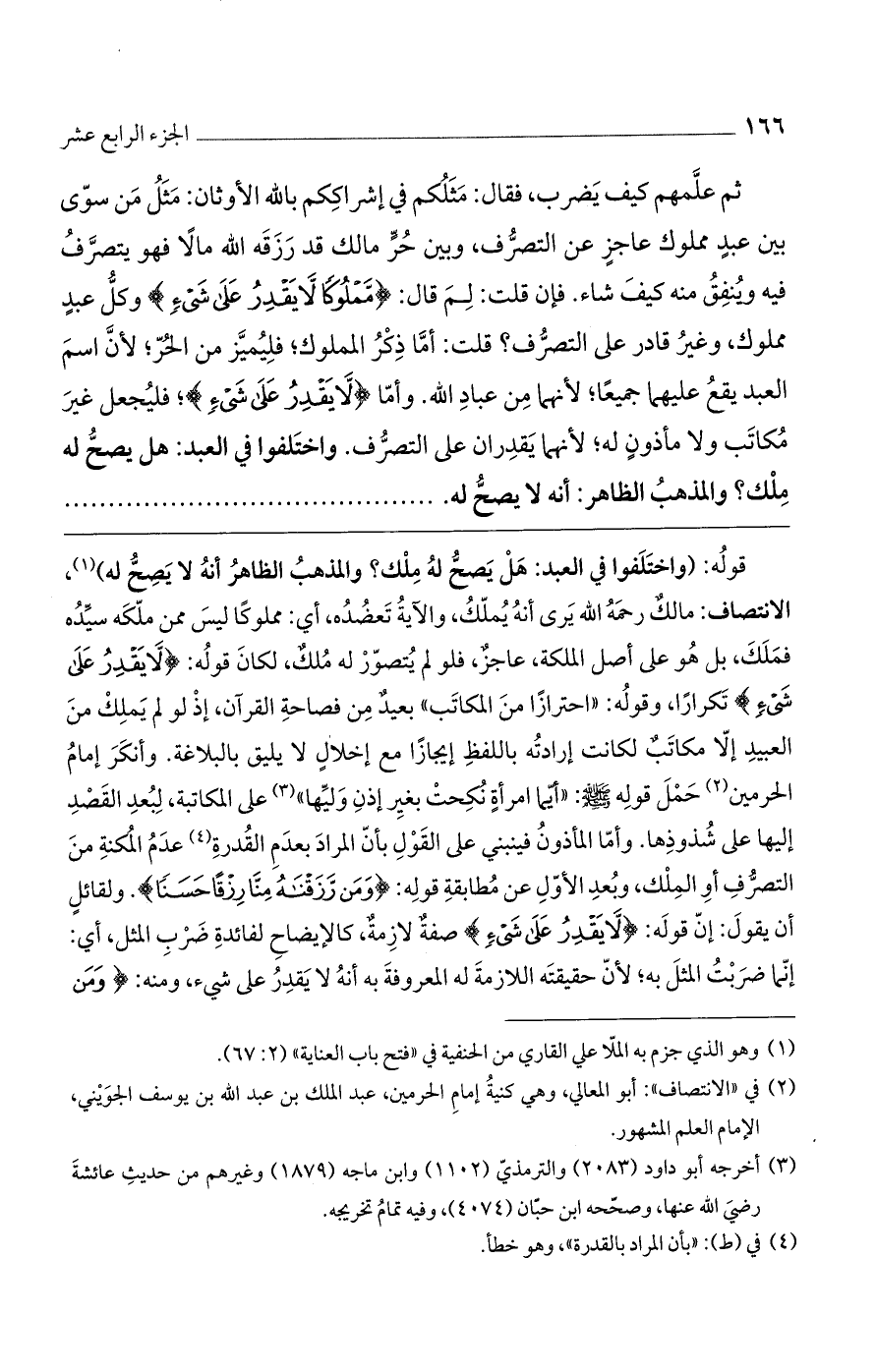 قوله: (واختلفوا في العبد: هل يصح له ملك؟ والمذهب الظاهر أنه لا يصح له)، الانتصاف: مالك رحمه الله يرى أنه يملك، والآية تعضده، أي: مملوكاً ليس ممن ملكه سيده فملك، بل هو على أصل الملكة، عاجزٌ، فلو لم يتصور له مُلكٌ، لكان قوله: (لا يَقْدِرُ عَلَى شَيْءٍ) تكراراً، وقوله: "احترازا من المكاتب" بعيدٌ من فصاحة القرآن، إذ لو لم يملك من العبيد إلا مكاتب لكانت إرادته باللفظ إيجازاً مع إخلال لا يليق بالبلاغة. وأنكر إمام الحرمين حمل قوله صلى الله عليه وسلم: "أيما امرأة نُكحت بغير إذن وليها" على المكاتبة، لبُعد القصد إليها على شذوذها. وأما المأذون فينبني على القول بان المراد بعدم القدرة عدم المكنة من التصرف أوالملك، وبُعد الأول عن مطابقة قوله: (وَمَنْ رَزَقْنَاهُ مِنَّا رِزْقاً حَسَناً). ولقائل أن يقول: إن قوله: (لا يَقْدِرُ عَلَى شَيْءٍ) صفة لازمة، كالإيضاح لفائدة ضرب المثل، أي: إنما ضربت المثل به؛ لأن حقيقته اللازمة له المعروفة به أنه لا يقدر على شيء، ومنه: (وَمَنْ