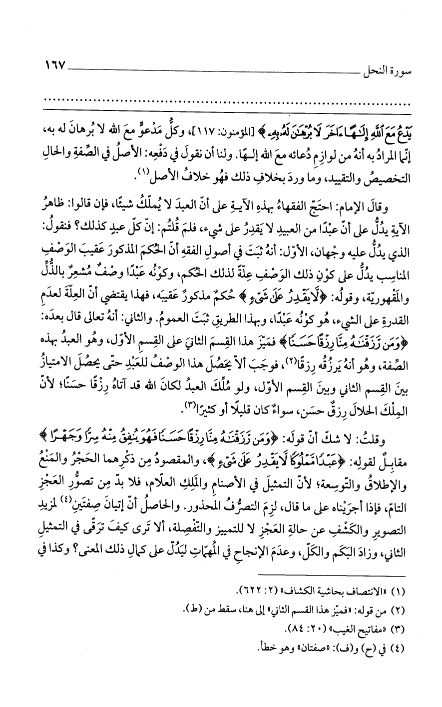 وقلت: لا شك أن قوله: (وَمَنْ رَزَقْنَاهُ مِنَّا رِزْقاً حَسَناً فَهُوَ يُنفِقُ مِنْهُ سِرّاً وَجَهْراً) مقابل لقوله: (عَبْداً مَمْلُوكاً لا يَقْدِرُ عَلَى شَيْءٍ)، والمقصود من ذكرهما الحجرُ والمنعُ والإطلاق والتوسعة؛ لأن التمثيل في الأصنام والملك العلام، فلابد من تصور العجز التام، فإذا أجريناه على ما قال، لزم التصرف المحذور. والحاصل أن إتيان صفتين لمزيد التصوير والكشف عن حالة العجز لا للتمييز والتفصلة، ألا ترى كيف ترقى في التمثيل الثاني، وزاد البكم والكل، وعدم الإنجاح في المهمات ليدل على كمال ذلك المعنى؟ وكذا في