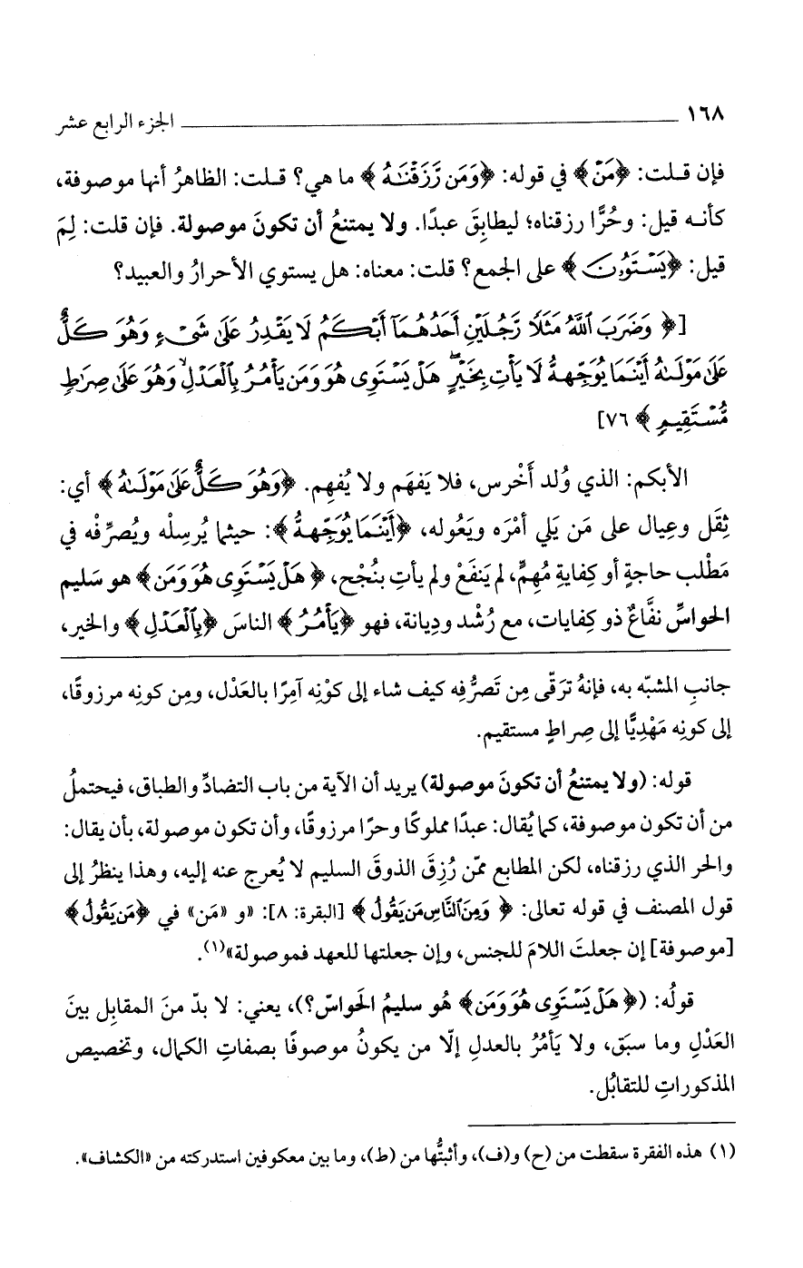 قوله: (ولا يمتنعُ أن تكون موصولة) يريد أن الآية من باب التضاد والطباق، فيحتمل من أن تكون موصوفة، كما يُقال: عبداً مملوكاً وحراً مرزوقاً، وأن تكون موصولة، بأن يقال: والحر الذي رزقناه، لكن المطابع ممن رُزق الذوق السليم لا يعرج عنه إليه، وهذا ينظر إلى قول المصنف في قوله تعالى: (وَمِنْ النَّاسِ مَنْ يَقُولُ) [البقرة: 8]: "و"مَن" في (مَنْ يَقُولُ) [موصوفة] إن جعلت اللام للجنس، وإن جعلتها للعهد فموصولة".