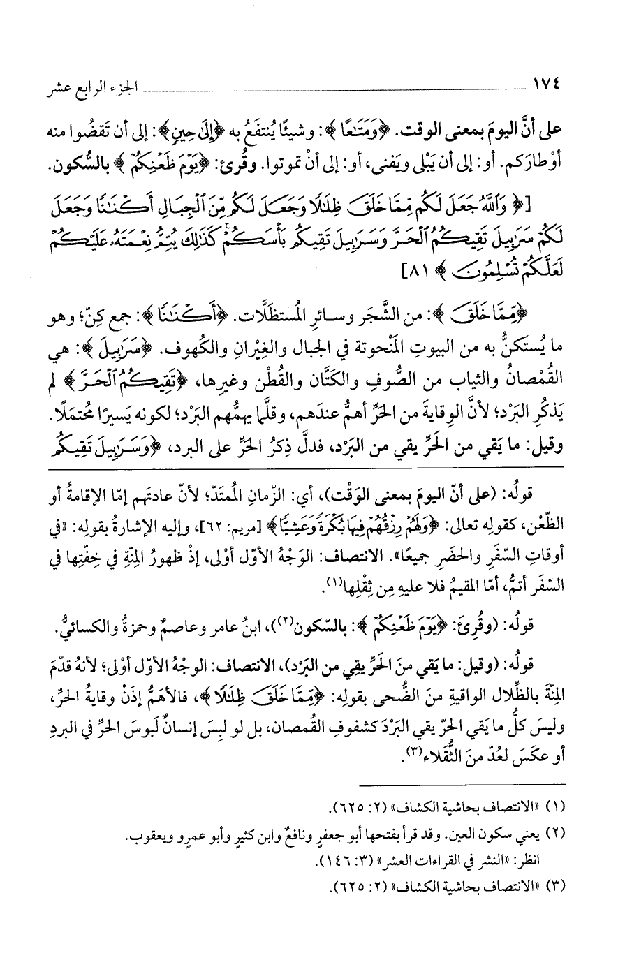 قوله: (وقيل: ما يقي من الحر يقي من البرد)، الانتصاف: الوجه الأول أولى؛ لأنه قدم المنة بالظلال الواقية من الضحى بقوله: (مِمَّا خَلَقَ ظِلالاً)، فالأهم إذن وقاية الحر، وليس ل ما يقي الحر يقي البرد كشفوف القمصان، بل لو لبس إنسان لبوس الحر في البرد أو عكس لعد من الثقلاء.