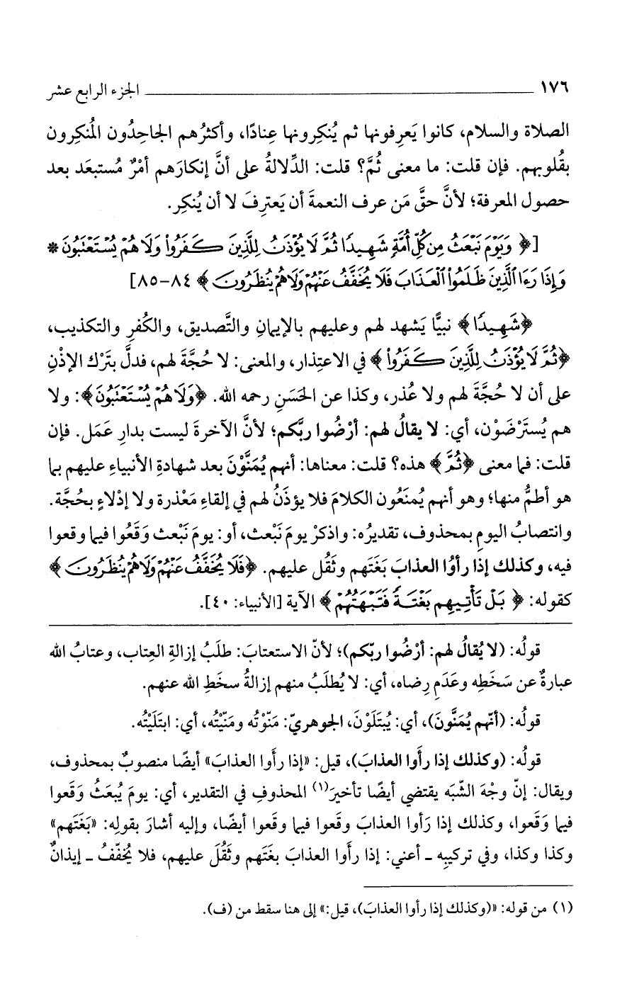 [(وَيَوْمَ نَبْعَثُ مِنْ كُلِّ أُمَّةٍ شَهِيداً ثُمَّ لا يُؤْذَنُ لِلَّذِينَ كَفَرُوا وَلا هُمْ يُسْتَعْتَبُونَ* وَإِذا رَأَى الَّذِينَ ظَلَمُوا الْعَذابَ فَلا يُخَفَّفُ عَنْهُمْ وَلا هُمْ يُنْظَرُونَ)].