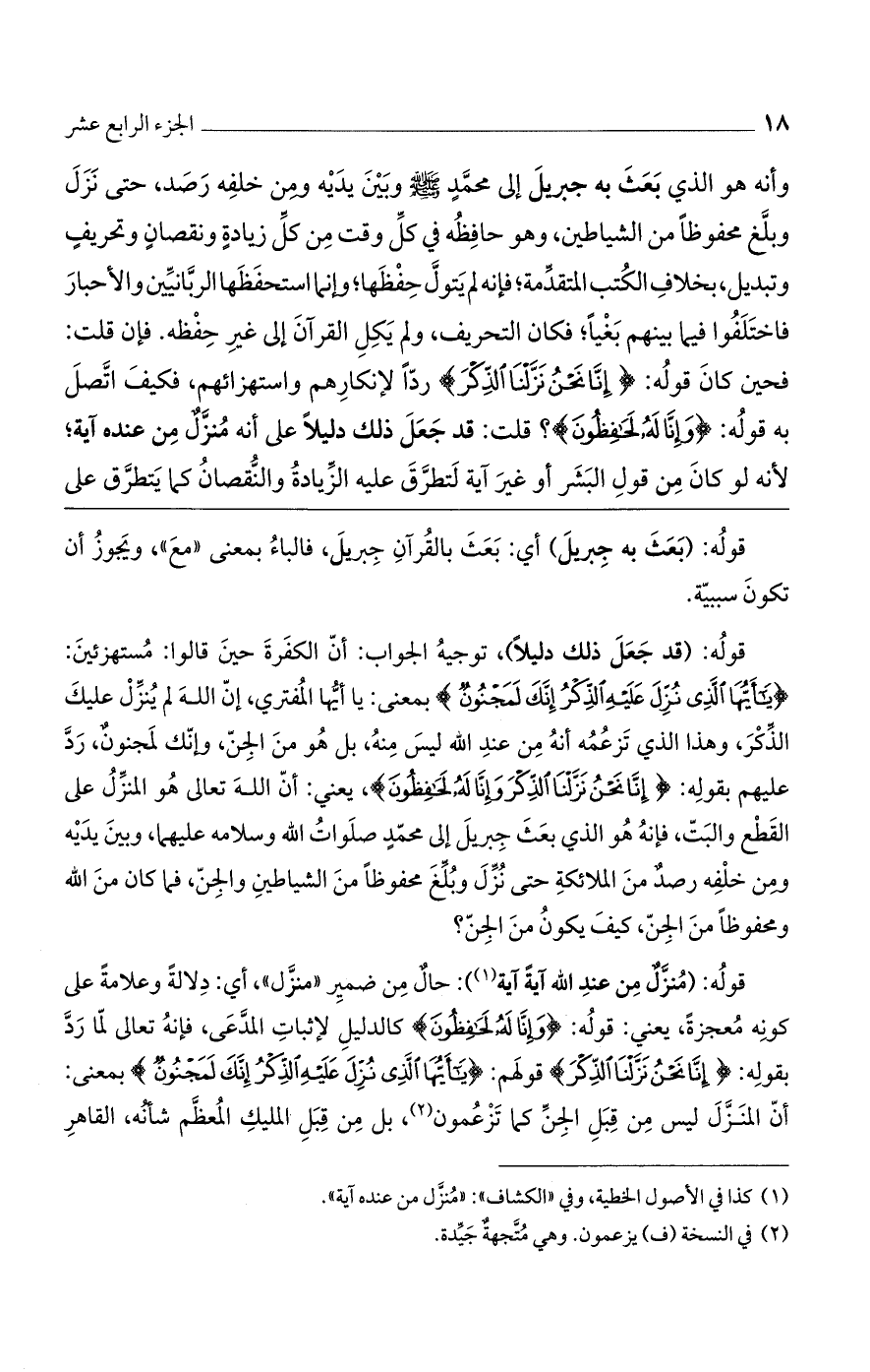 قوله: (قد جعل ذلك دليلا)، توجيه الجواب: أن الكفرة حين قالوا: مستهزئين: (يَا أَيُّهَا الَّذِي نُزِّلَ عَلَيْهِ الذِّكْرُ إِنَّكَ لَمَجْنُونٌ) بمعنى: يا أيها المفتري، إن الله لم يُنزل عليك الذكر، وهذا الذي تزعمه أنه من عند الله ليس منه، بل هو من الجن، وإنك لمجنون، رد عليهم بقوله: (إِنَّا نَحْنُ نَزَّلْنَا الذِّكْرَ وَإِنَّا لَهُ لَحَافِظُونَ)، يعني: أن الله تعالى هو المنزل على القطع والبت، فإنه هو الذي بعث جبريل إلى محمد صلوات الله وسلامه عليهما، وبين يديه ومن خلفه رصد من الملائكة حتى نُزلَ وبُلغ محفوظاً من الشياطين والجن، فما كان من الله ومحفوظاً من الجن، كيف يكون من الجن؟
