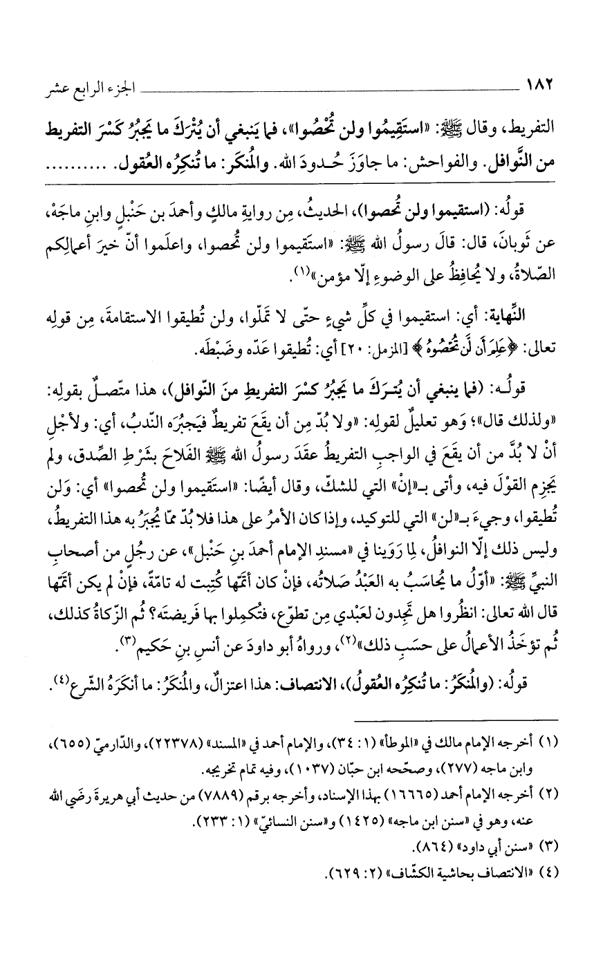 النهاية: أي: استقيموا في كل شيء حتى لا تملوا، ولن تطيقوا الاستقامة، من قوله تعالى: (عَلِمَ أَنْ لَنْ تُحْصُوهُ) [المزمل: 20] أي: تطيقوا عده وضبطه.
