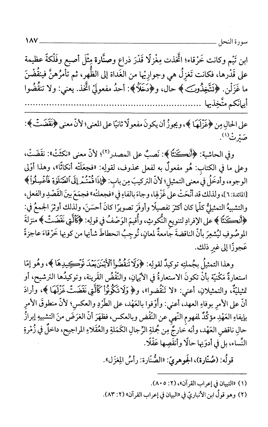 وفي الحاشية: (أَنكَاثاً): نصب على المصدر؛ لأن معنى "نكثت": نقضت، وعلى ما في الكتاب: هو مفعولٌ به لفعل محذوف، لقوله: "فجعلته أنكاثاً"، وهذا أولى الوجوه، وأدخلُ في معنى التمثيل؛ لأن التركيب من باب: (إِذَا قُمْتُمْ إِلَى الصَّلاةِ فَاغْسِلُوا) [المائدة: 6]، ولذلك قد أنحت على غزلها، وجاء بالفاء في "فجعلته" فجمع بين القصد والفعل، والتشبيه التمثيليُّ كلما كان أكثر تفصيلاً وأوفر تصويراً كان أحسن، ولذلك أوثر الجمع في: (أَنكَاثاً) على الإفراد لتنويع النكوث، وأقيم الوصف في قوله: (كَالَّتِي نَقَضَتْ) منزلة الموصوف ليشعر بأن الناقضة جامعة لمعانٍ، توجبُ انحطاط شأنها من كونها خرقاء عاجزة عجوزاً إلى غير ذلك.