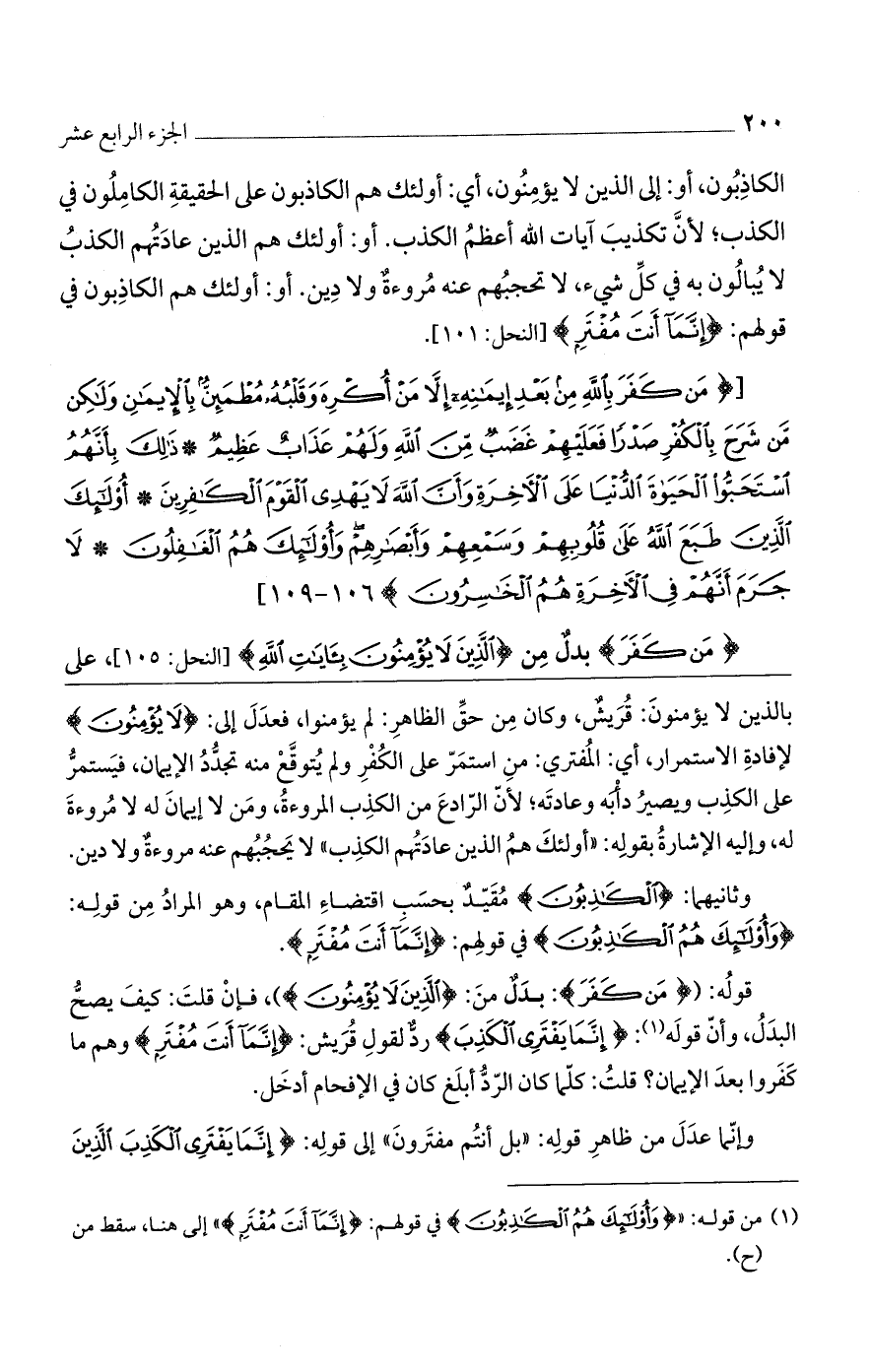 وثانيهما: (الْكَاذِبُونَ) مقيدٌ بحسب اقتضاء المقام، وهو المراد من قوله: (أُوْلَئِكَ هُمْ الْكَاذِبُونَ) في قولهم: (إِنَّمَا أَنْتَ مُفْتَرٍ).