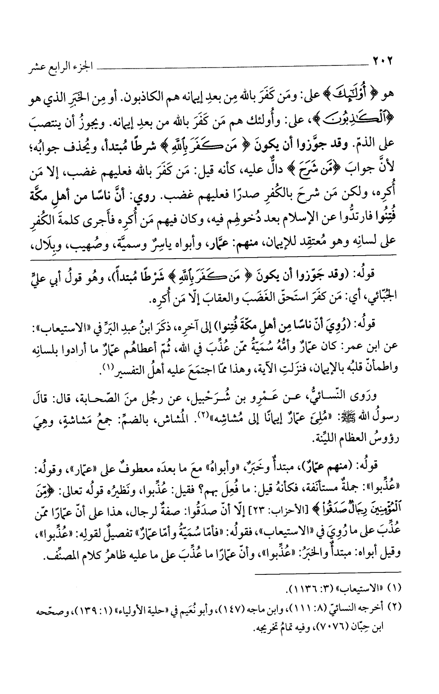 قوله: (رُوي أن ناساً من أهل مكة فُتنوا) إلى آخره، ذكر ابن عبد البر في "الاستيعاب": عن ابن عمر: كان عمار وأمه سمية ممن عُذب في الله، ثم أعطاهم عمار ما أرادوا بلسانه واطمأن قلبه بالإيمان، فنزلت الآية، وهذا مما اجتمع عليه أهل التفسير.