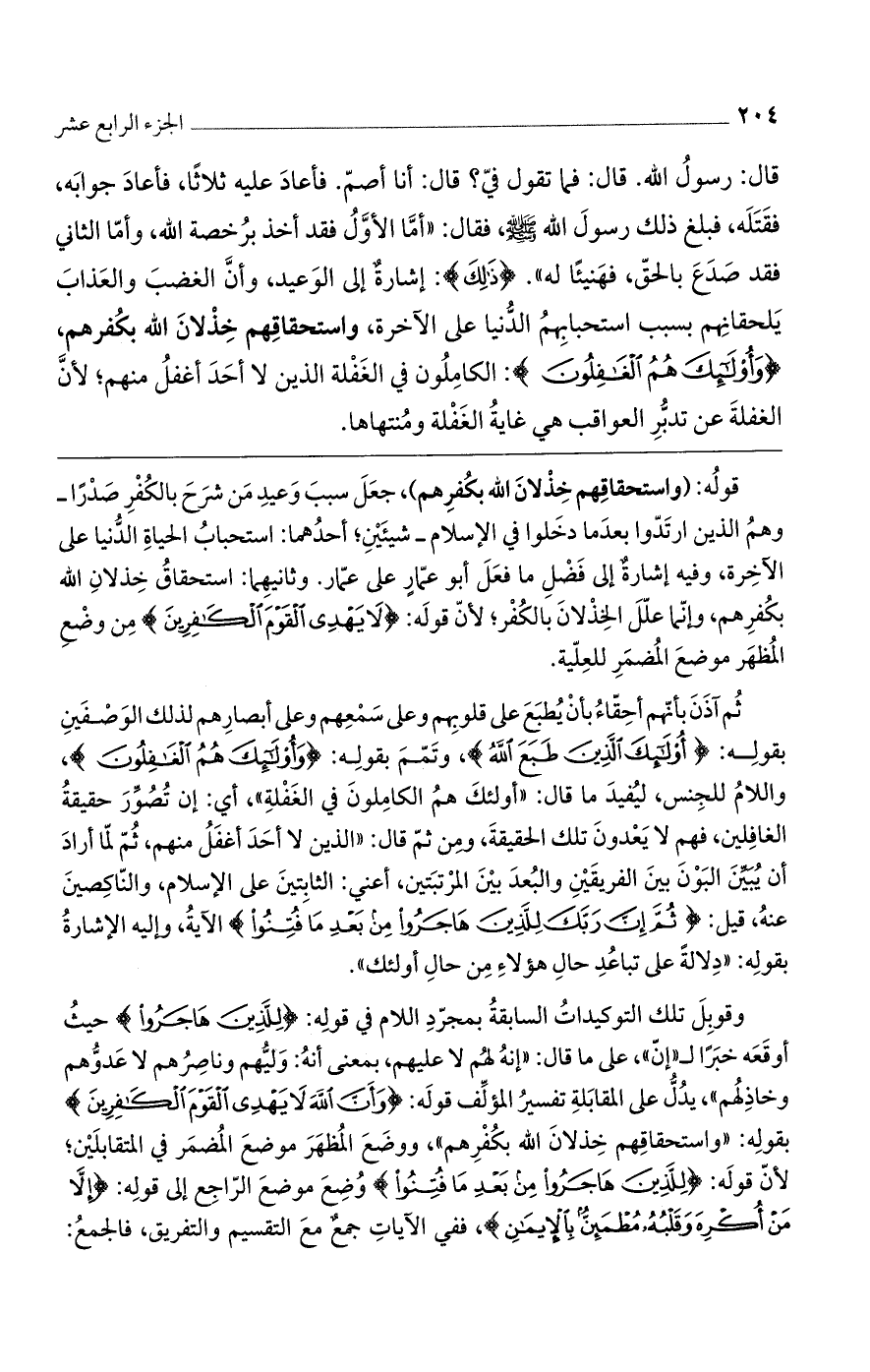 قال: رسول الله. قال: فما تقول فيّ؟ قال: أنا أصمّ. فأعاد عليه ثلاثاً، فأعاد جوابه، فقتله، فبلغ ذلك رسول الله صلى الله عليه وسلم فقال: «أما الأوّل فقد أخذ برخصة الله. وأمّا الثاني فقد صدع بالحق فهنيئاً له» (ذلِكَ) إشارة إلى الوعيد، وأنّ الغضب والعذاب يلحقانهم بسبب استحبابهم الدنيا على الآخرة، واستحقاقهم خذلان الله بكفرهم، (وَأُولئِكَ هُمُ الْغافِلُونَ): الكاملون في الغفلة، الذين لا أحد أغفل منهم، لأنّ الغفلة عن تدبر العواقب هي غاية الغفلة ومنتهاها.