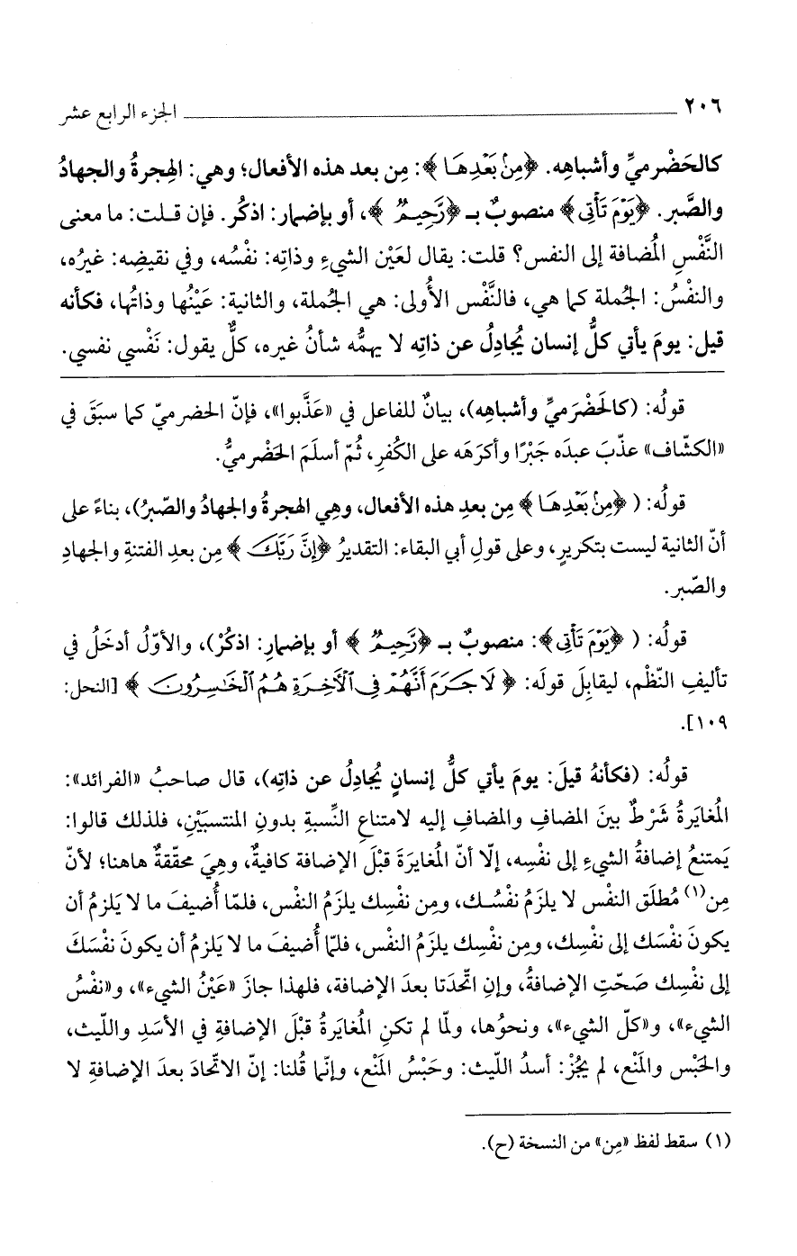 قوله: ((يَوْمَ تَاتِي): منصوب بـ (رَّحِيمُ) أو بإضمار: اذكر)، والأول أدخل في تأليف النظم، ليقابل قوله: (لا جَرَمَ أَنَّهُمْ فِي الآخِرَةِ هُمْ الأَخْسَرُونَ) [النحل: 109].