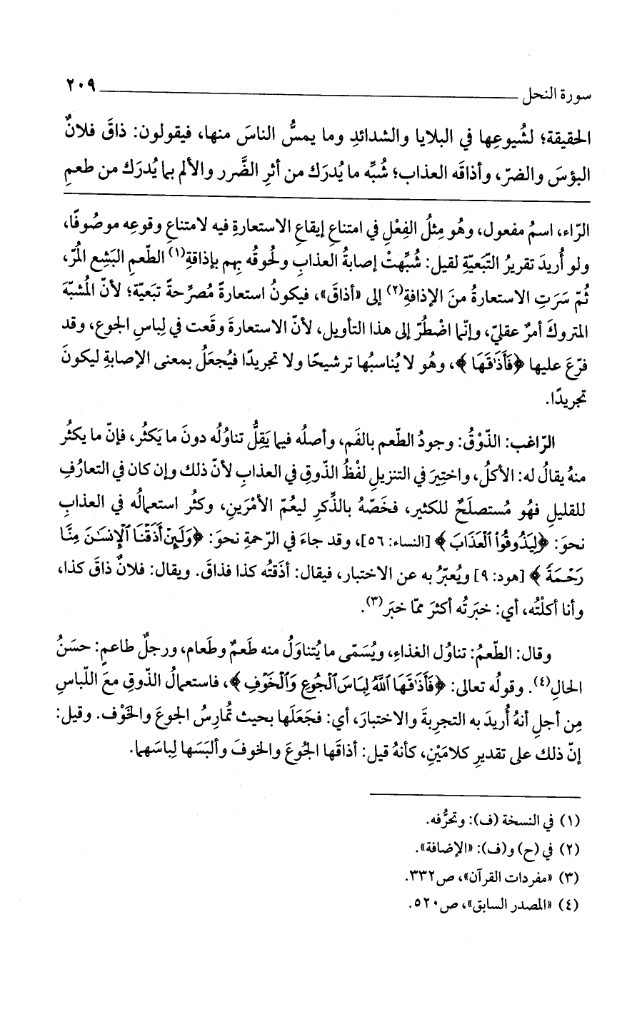 وقال: الطعم: تناول الغذاء، ويسمى ما يتناول منه طعم وطعام، ورجل طاعم: حسن الحال. وقوله تعالى: (فَأَذَاقَهَا اللَّهُ لِبَاسَ الْجُوعِ وَالْخَوْفِ)، فاستعمال الذوق مع اللباس من أجل أنه أريد به التجربة والاختبار، أي: فجعلها بحيث تمارس الجوع والخوف. وقيل: إن ذلك على تقدير كلامين، كأنه قيل: أذاقها الجوع والخوف وألبسها لباسهما.