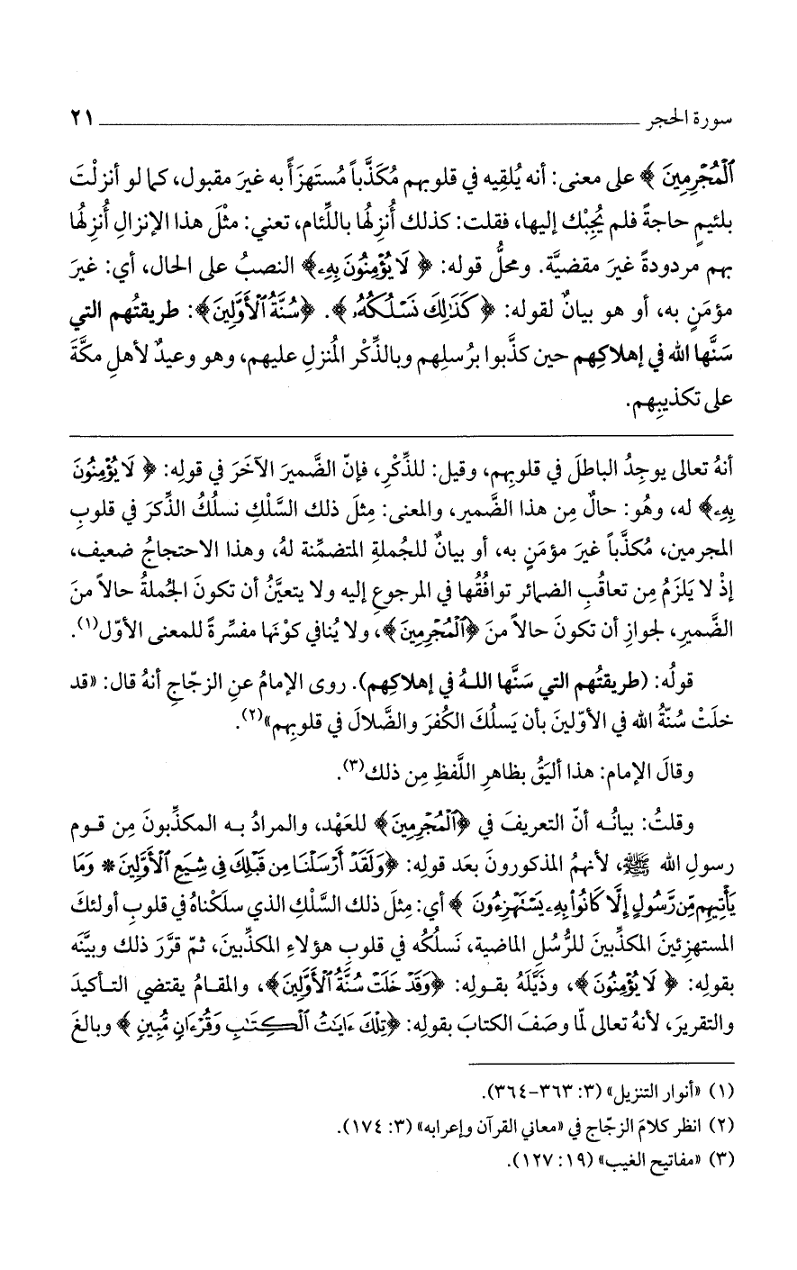وقلت: بيانه أن التعريف في (الْمُجْرِمِينَ) للعهد، والمراد به المكذبون من قوم رسول الله صلى الله عليه وسلم، لأنهم المذكورون بعد قوله: (وَلَقَدْ أَرْسَلْنَا مِنْ قَبْلِكَ فِي شِيَعِ الأَوَّلِينَ * وَمَا يَاتِيهِمْ مِنْ رَسُولٍ إِلاَّ كَانُوا بِهِ يَسْتَهْزِئُونَ) أي: مثل ذلك السلك الذي سلكناه في قلوب أولئك المستهزئين المكذبين للرسل الماضية، نسلكه في قلوب هؤلاء المكذبين، ثم قرر ذلك وبينه بقوله: (لا يُؤْمِنُونَ)، وذيله بقوله: (وَقَدْ خَلَتْ سُنَّةُ الأَوَّلِينَ)، والمقام يقتضي التأكيد والتقرير، لأنه تعالى لما وصف الكتاب بقوله: (تِلْكَ آيَاتُ الْكِتَابِ وَقُرْآنٍ مُبِينٍ) وبالغ