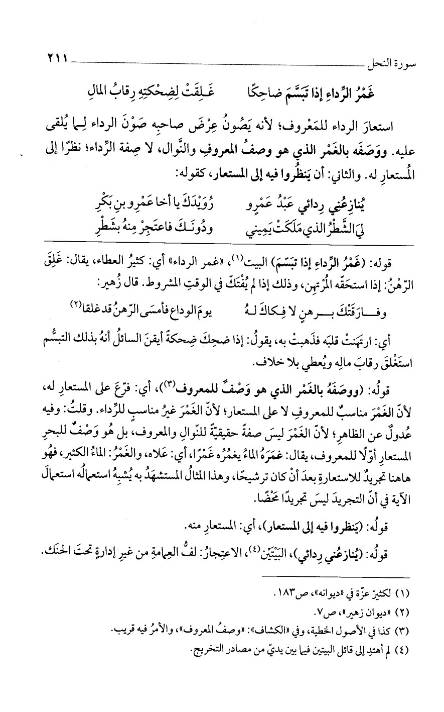 استعارة الرداء للمعروف، لأنه يصون عرض صاحبه صون الرداء لما يلقى عليه. ووصفه بالغمر الذي هو وصف المعروف والنوال، لا صفة الرداء، نظر إلى المستعار له. والثاني: أن ينظروا فيه إلى المستعار، كقوله: