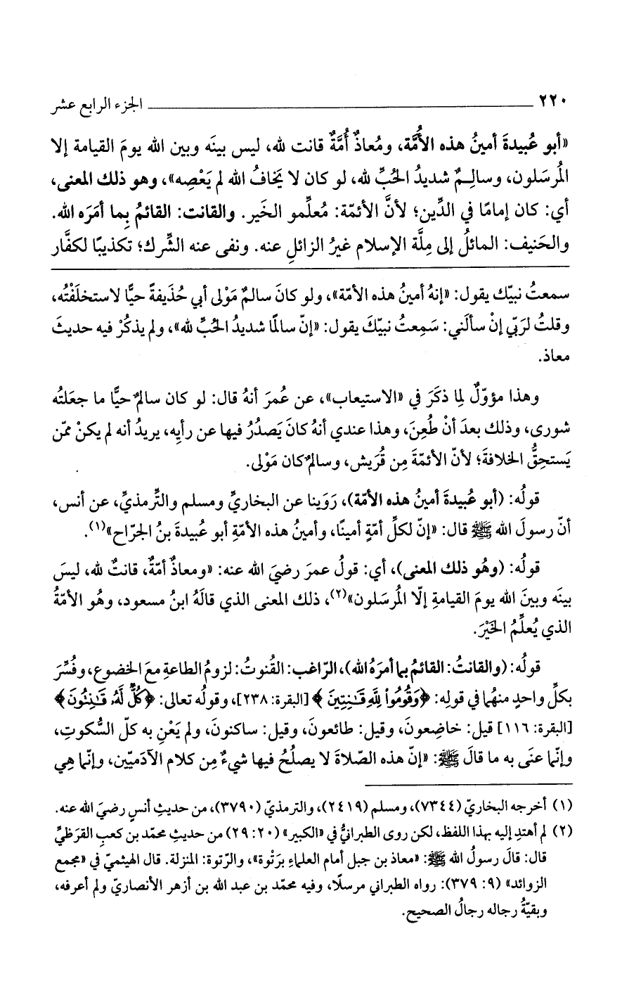 «أبو عبيدة أمين هذه الأمّة، ومعاذ أمّة قانت لله، ليس بينه وبين الله يوم القيامة إلا المرسلون، وسالم شديد الحب لله، لو كان لا يخاف الله لم يعصه. وهو ذلك المعنى، أي: كان إماما في الدين، لأنّ الأئمة معلمو الخير. والقانت: القائم بما أمره الله. والحنيف: المائل إلى ملة الإسلام غير الزائل عنه. ونفى عنه الشرك تكذيبا لكفار