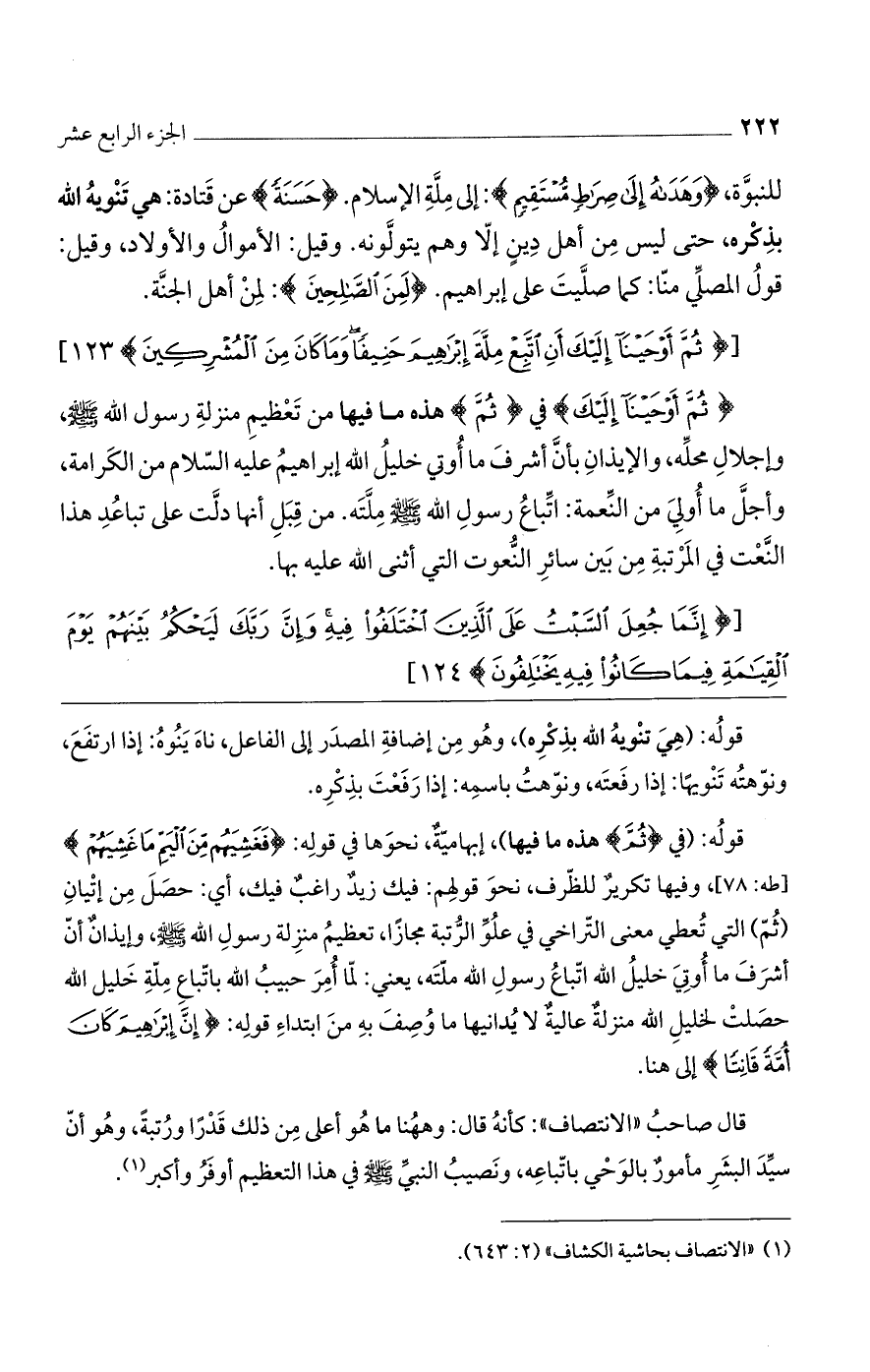 قوله: (في (ثُمَّ) هذه ما فيها)، إبهامية، نحوها في قوله: (فَغَشِيَهُمْ مِنْ الْيَمِّ مَا غَشِيَهُمْ) [طه: 78]، وفيها تكرير للظرف، نحو قولهم: فيك زيدٌ راغبٌ فيك، أي: حصل من إتيان (ثم) التي تُعطي معنى التراخي في علو الرتبة مجازاً، تعظيم منزلة رسول الله صلى الله عليه وسلم، وإيذان أن أشرف ما أوتي خليل الله اتباع رسول الله ملته، يعني: لما أُمر حبيب الله باتباع ملة خليل الله حصلت لخليل الله منزلة عالية لا يُدانيها ما وُصف به من ابتداء قوله: (إِنَّ إِبْرَاهِيمَ كَانَ أُمَّةً قَانِتاً) إلى هنا.